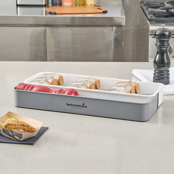 Optimize your kitchen storage with versatile spice organization. The Clean Tek Professional Gray and White Plastic Expandable 3-Tier Spice Drawer Organizer features an expandable design that adapts to accommodate various spice jar sizes. Its sleek gray color seamlessly complements modern kitchen aesthetics. This tiered spice organizer maximizes drawer storage space by utilizing its compact size, measuring 15.55 inches in length, 5.51 inches in width, and 2.17 inches in height, allowing you to efficiently manage your kitchen tools and spices. The tiered design prevents jars from rolling and ensures labels remain visible, enhancing your efficiency in busy foodservice settings. With non-slip feet, this spice jar holder stays securely in place. Suitable for drawers with a minimum height of 3.25 inches, this organizer fits various drawer dimensions, expanding up to 8.93 inches. Each order includes 1 organizer.