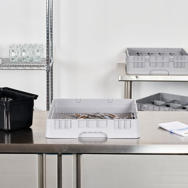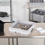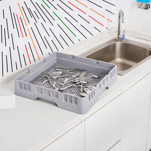 Upgrade your kitchen setup with our Clean Tek Professional Gray Flatware Rack. This durable flatware rack is made from premium plastic, ensuring it withstands daily use for long-lasting performance. Featuring open interior compartments, this plastic rack ensures enhanced cleaning, allowing every piece of flatware to sparkle. For added convenience, the solid external walls of this plastic drying rack offer robust protection during transport and storage. The easy-to-handle design of this commercial dish rack makes it a practical choice for quick and safe loading and unloading. Measuring 19.69 inches in length by 19.69 inches in width by 3.98 inches in height, this restaurant dishwasher rack provides ample space for all your flatware needs. Sold in a 1 count box.