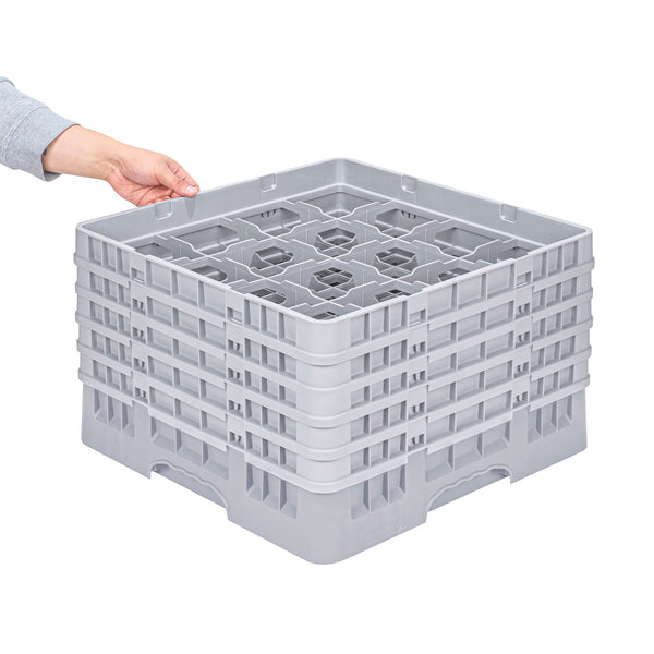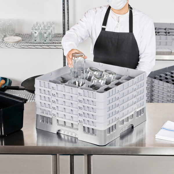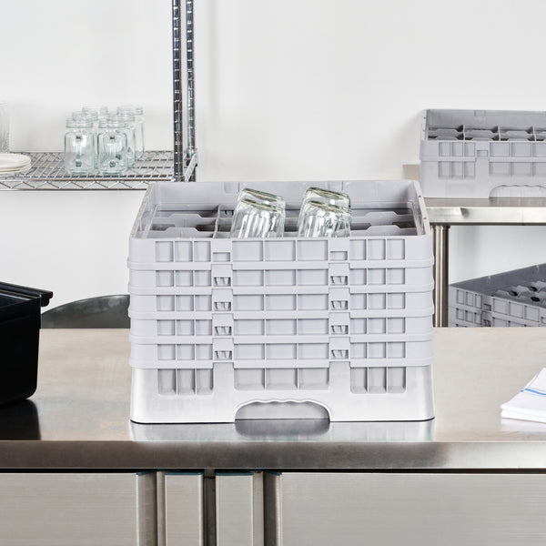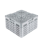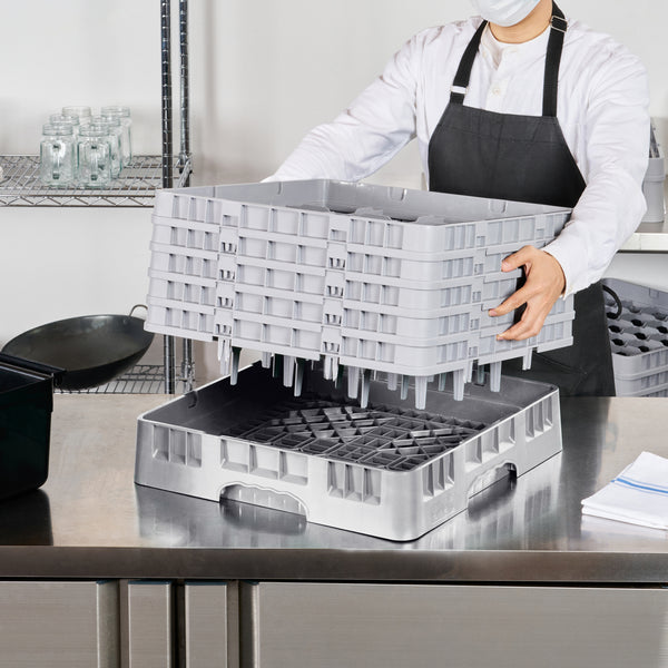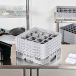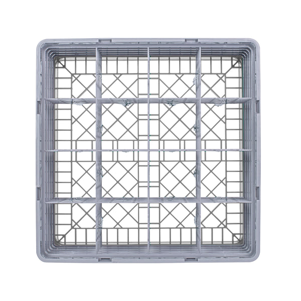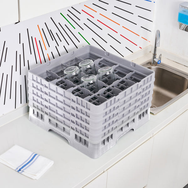 Optimize your glassware storage with our Clean Tek Professional Gray Glass Rack, designed to meet the rigorous demands of the foodservice industry. Featuring 16 compartments, this dishwasher rack ensures each piece of glassware is securely held and safely cleaned. Equipped with 1 full drop extender, this rack provides flexible glassware storage solutions for varying heights. With 4 half drop extenders, this compartment rack allows for customizable configurations to accommodate a variety of glass sizes. Constructed from durable PP, this barware organizer withstands the harsh conditions of commercial kitchens. The easy-to-handle design ensures that this commercial glass rack can be effortlessly maneuvered during busy service hours. Plus, the open interior compartments of this rack promote efficient drying and quick sanitation of glassware. Solid external walls provide added protection, ensuring your glassware remains intact during storage and transport. Measuring 19.69 inches in length by 19.69 inches in width by 12.13 inches in height, this glass rack fits seamlessly into most commercial dishwashers. Sold in a 1 count box.