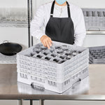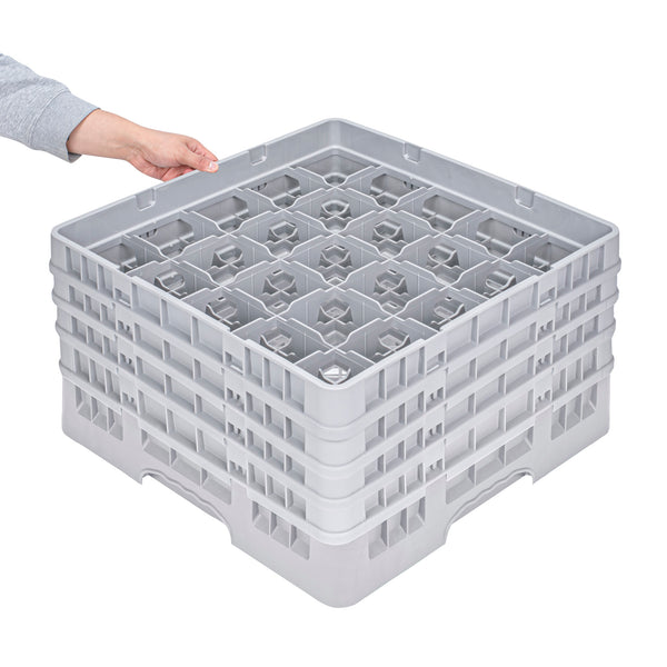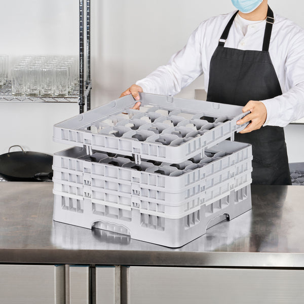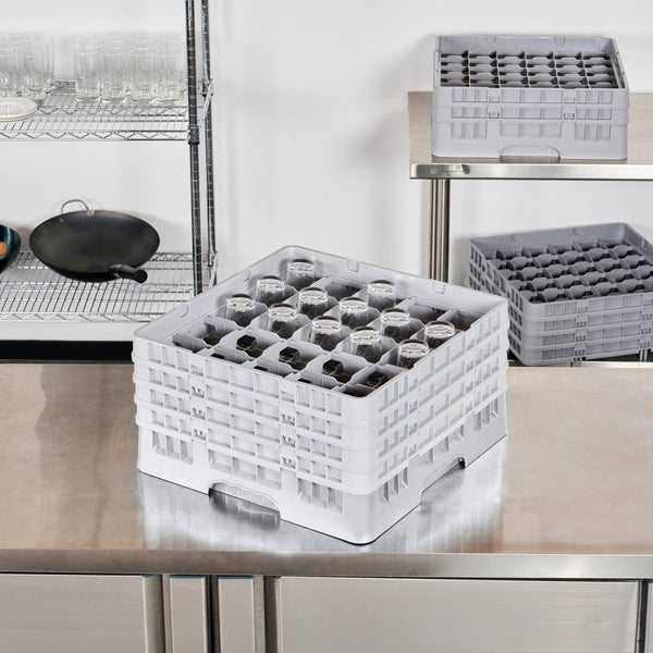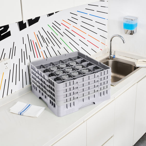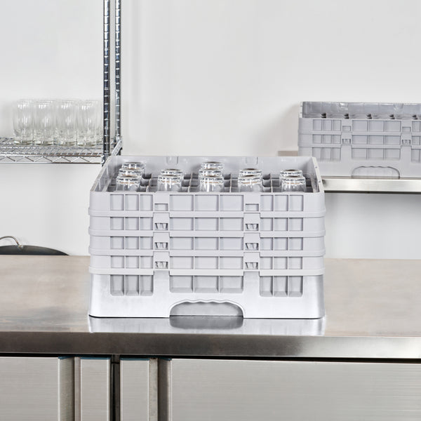 Efficiently organize your kitchen with our Clean Tek Professional Gray Glass Rack, perfect for all your glassware storage needs. This commercial glass rack boast 25 compartments, ensuring each piece of glassware is neatly separated and protected. With a dishwasher rack design, the 1 full drop extender and 3 half drop extenders add flexibility to accommodate various glass heights. Crafted from durable PP, this compartment rack ensure long-lasting performance in busy settings. The easy-to-handle design makes this barware organizer a breeze to maneuver during hectic service hours. Featuring open interior compartments, this rack allow for optimal water flow and thorough cleaning. Solid external walls provide added strength and stability, ensuring your glassware remains secure. Measuring 19.69 inches in length by 19.69 inches in width by 10.51 inches in height, this rack is designed to fit seamlessly into commercial dishwashing setups. Sold in a 1 count box.