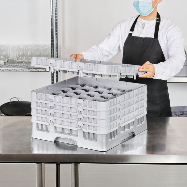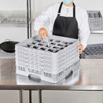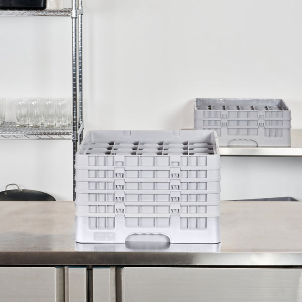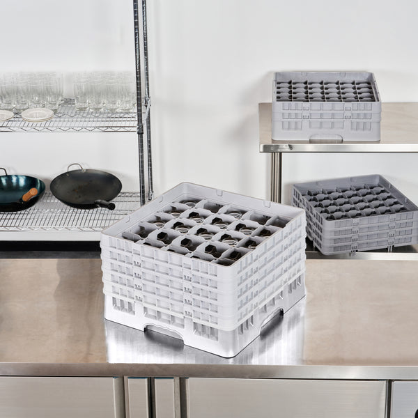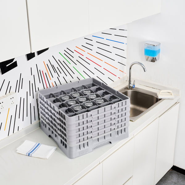 Optimize your glassware storage with our Clean Tek Professional Gray Glass Rack. This commercial glass rack features 25 compartments, providing ample space for organizing barware and ensuring each glass is securely held. Designed with an easy-to-handle structure, this dishwasher rack allows for effortless transport and loading. The 1 full drop extender and 4 half drop extenders make this compartment rack incredibly versatile, adapting to various glass heights with ease. Built from durable PP, this glass rack is sturdy and long-lasting, ideal for daily commercial use. With open interior compartments, this barware organizer ensures thorough cleaning and quick drying. Solid external walls provide additional protection during storage and transport, keeping glassware safe. Measuring 19.69 inches in length by 19.69 inches in width by 12.13 inches in height, this commercial glass rack perfectly fits standard dishwasher dimensions. Sold in a 1 count box.