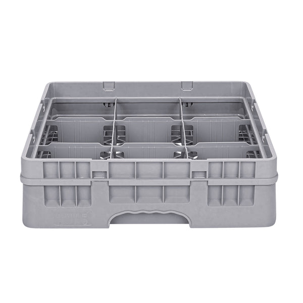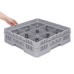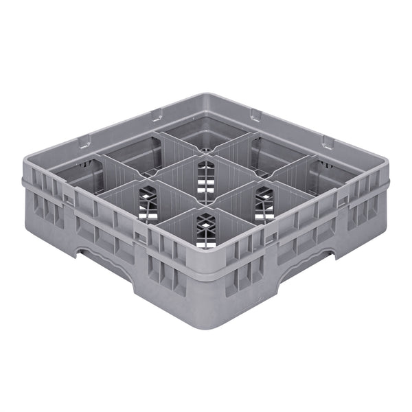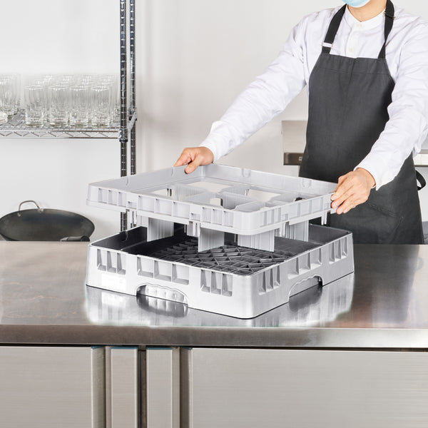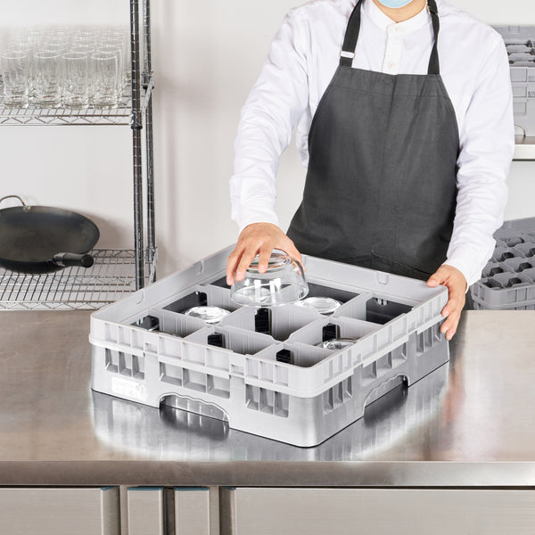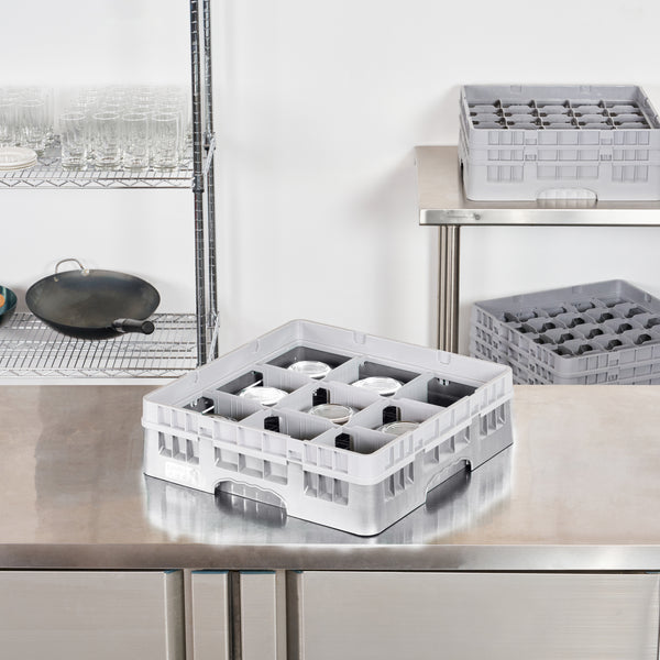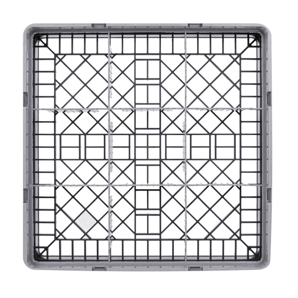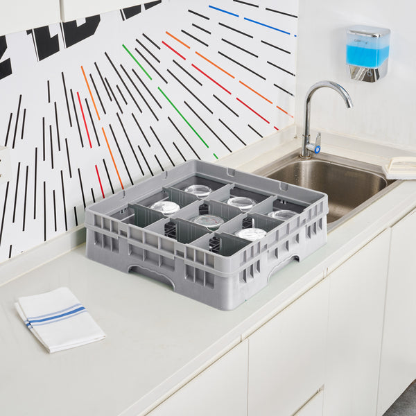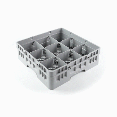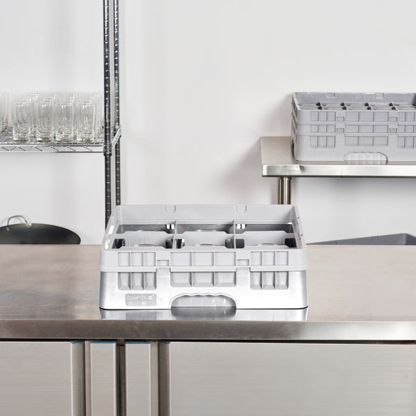 Boost your glassware storage efficiency with our Clean Tek Professional Gray Glass Rack. This commercial glass rack features open interior compartments for enhanced cleaning, ensuring your glasses are spotless after each wash. Designed to hold up to 9 glasses, this dishwasher rack keeps your barware organized and ready for use. With 9 compartments, this compartment rack provides ample space for a variety of glass sizes. Solid external walls offer protection, safeguarding your delicate glasses from damage. Every rack includes 1 full drop extender, accommodating taller glassware with ease. Made of durable polypropylene, this barware organizer is built to withstand heavy-duty use in busy kitchens. The easy-to-handle design makes transporting and storing your glassware effortless. Measuring 19.69 inches in length by 19.69 inches in width by 5.63 inches in height, this rack fits perfectly into commercial dishwashers. Sold in a 1 count box.