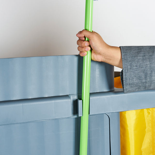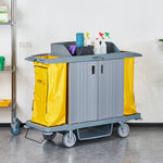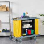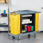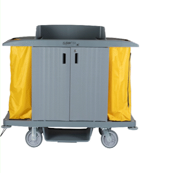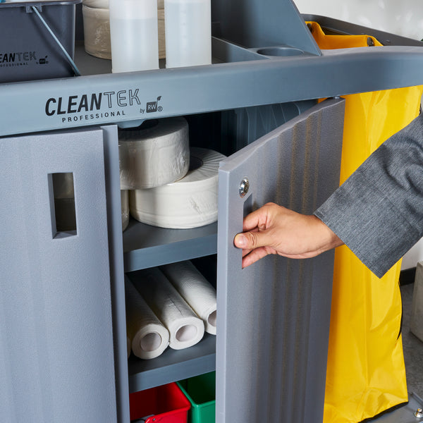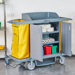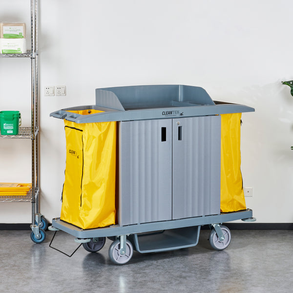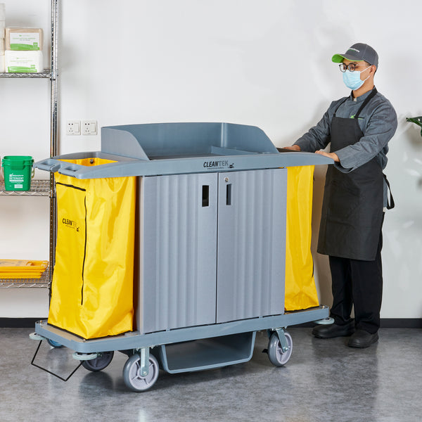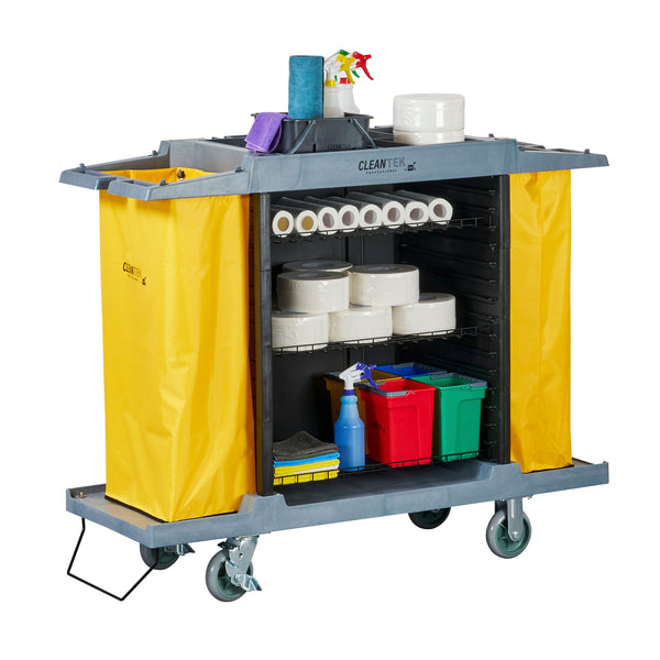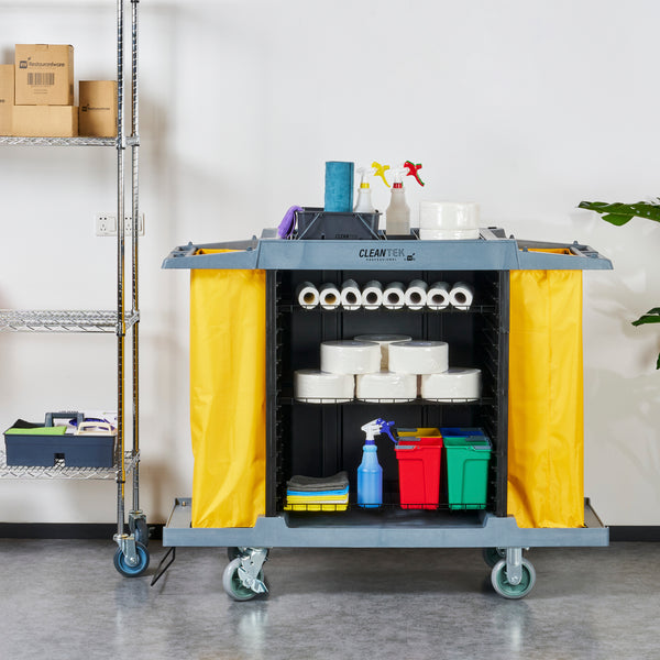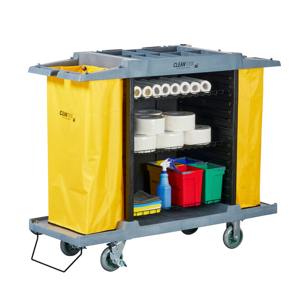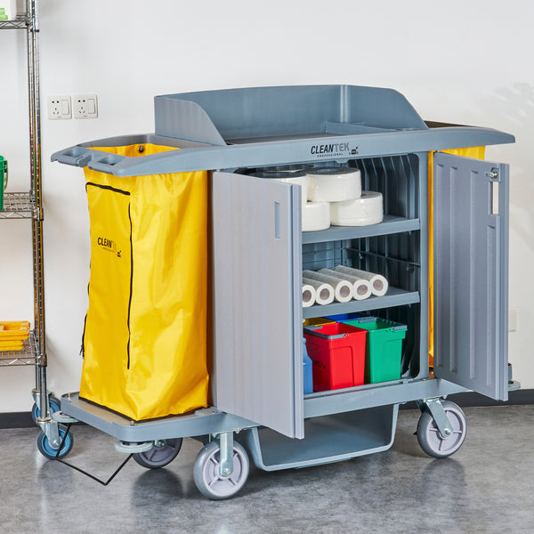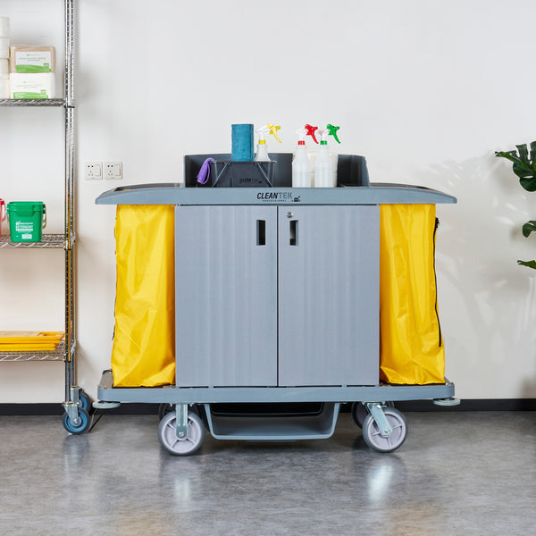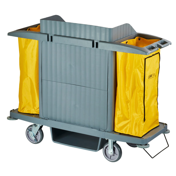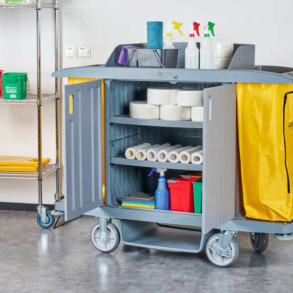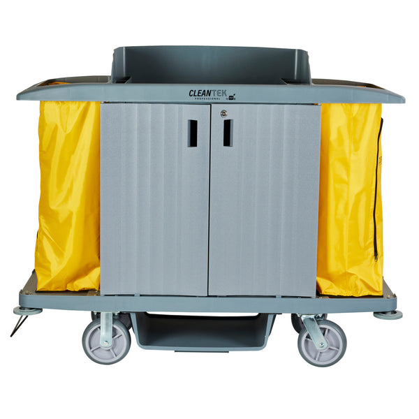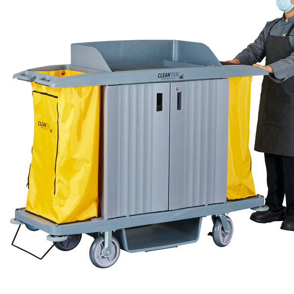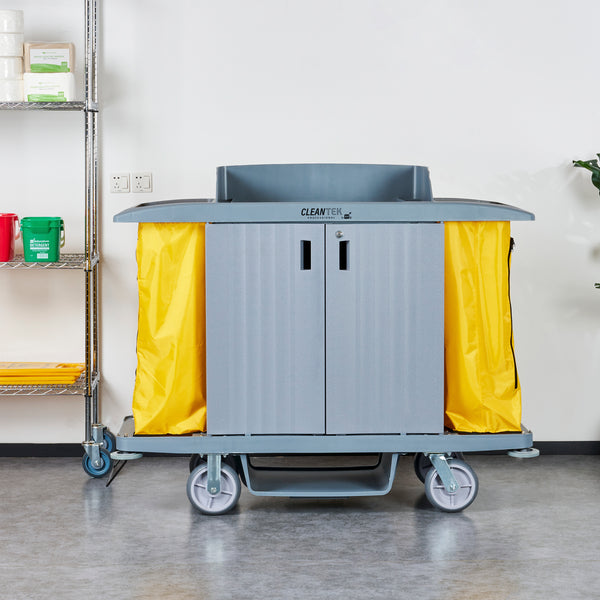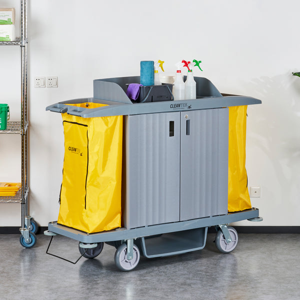 Elevate your cleaning efficiency with our Clean Tek Professional Gray Hotel / Housekeeping Cart. This housekeeping cart comes with 2 rugged 20-gallon bags, providing ample space for waste or laundry collection. Featuring 2 locking doors, this housekeeping trolley ensures valuable cleaning supplies are safeguarded while being transported from room to room. Equipped with 3 locking shelves, this cleaning cart offers ample storage space for all your cleaning supplies and equipment, promoting efficiency and organization during any task. The 8 top shelf compartments on this maid cart provide easy access to your most-used supplies with its own designated spot for increased organization. Plus, the top shelf on this gray cleaning cart helps keep your cleaners and liquids upright while in motion. With 2 handles, this gray maid cart is easy to maneuver down hallways and around tight spaces. This cleaning trolley is equipped with 4 casters and provides convenient mobility, allowing it to glide smoothly across various surfaces. Measuring 60.63 inches in length by 21.26 inches in width by 50.59 inches in height, this 3-shelf maid cart offers substantial space while maintaining a compact form. Sold in a box with 1 housekeeping cart and 2 bags.