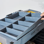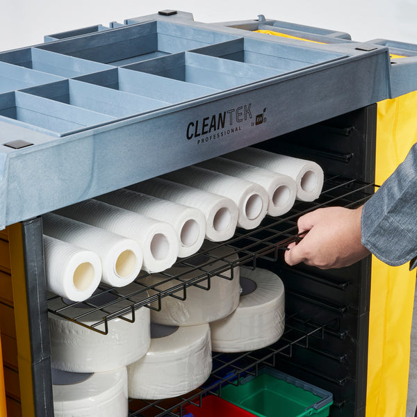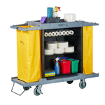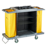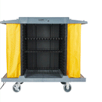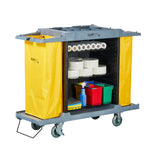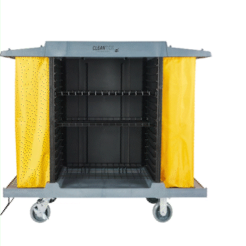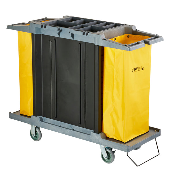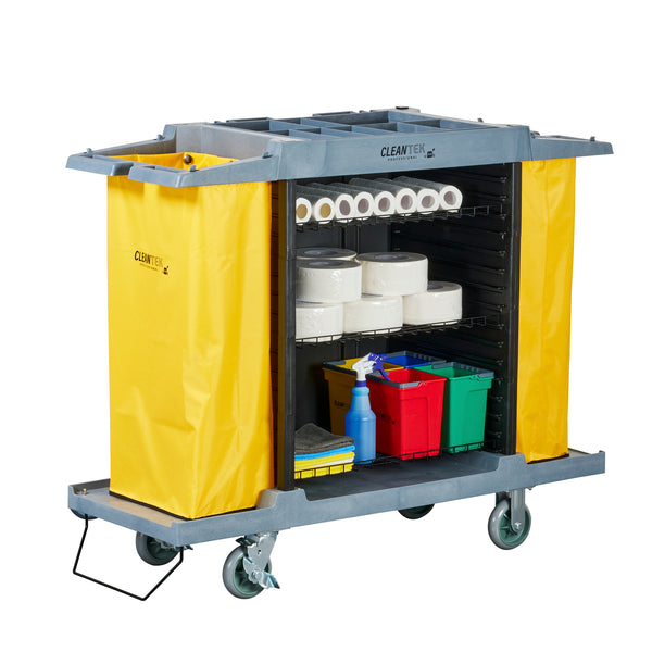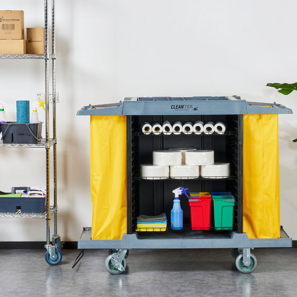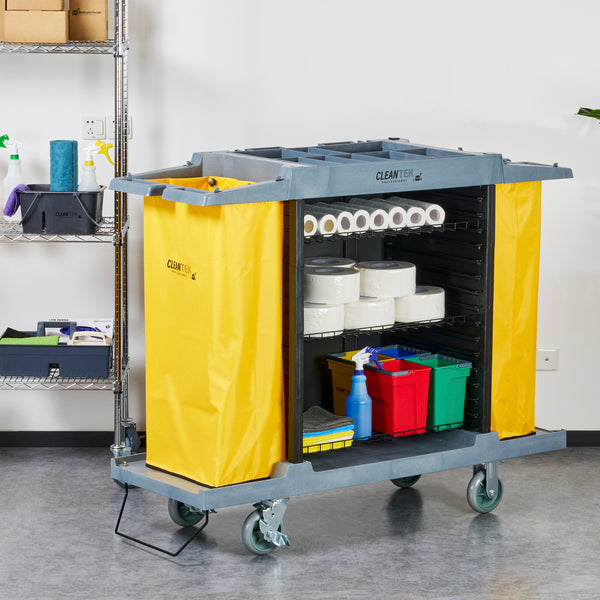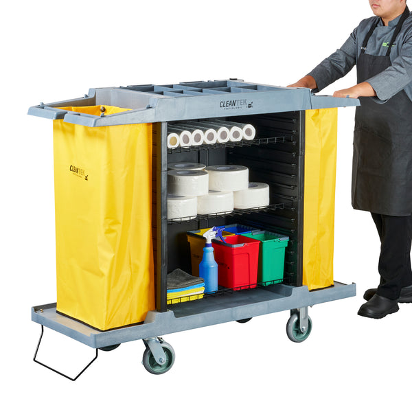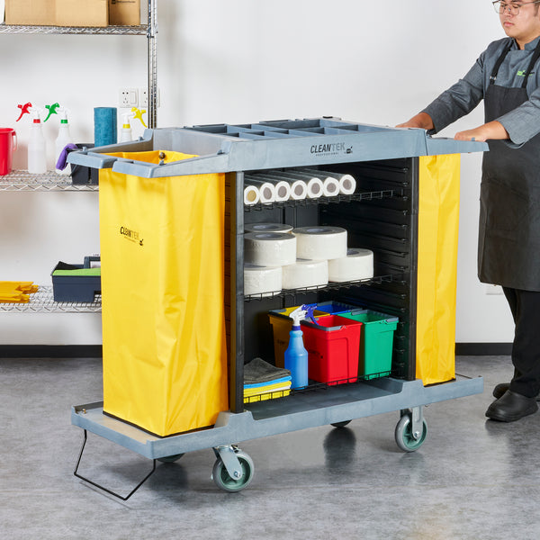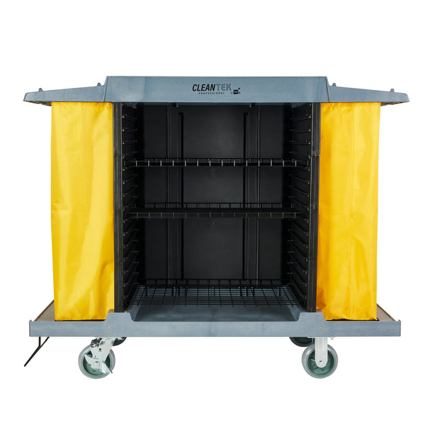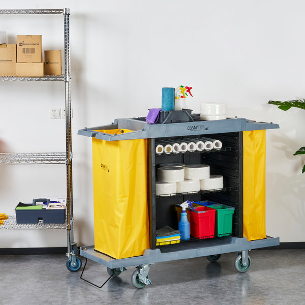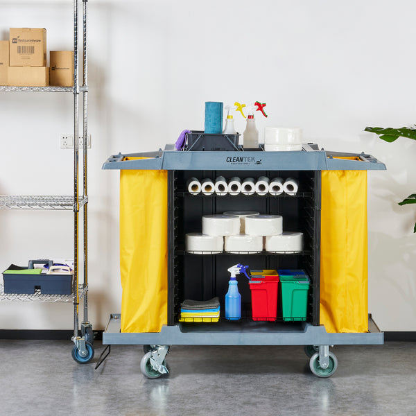 Elevate your cleaning efficiency with our Clean Tek Professional Gray Hotel / Housekeeping Cart. Designed with functionality in mind, this housekeeping trolley comes with 2 rugged 20-gallon bags, providing ample space for waste or laundry collection, and can be attached to either side of the cart for maximum flexibility. This cleaning cart features 4 sturdy shelves to offer abundant storage space for all your essential cleaning supplies and equipment, ensuring organization in every task. With 8 top shelf compartments, this maid cart allows easy access to your most-used supplies and provides them with its designated spot, boosting organization and efficiency. Plus, the top shelf on this cleaning trolley is designed to keep your cleaners and liquids upright, preventing spills during movement. Equipped with two handles, this housekeeping cart allows you to guide them comfortably down hallways and around tight spaces. The 4 smooth-rolling casters of this gray housekeeping cart glide across various surfaces, making it easy to maneuver in confined areas. Measuring 59.06 inches in length by 21.26 inches in width by 47.24 inches in height, this 4-shelf housekeeping trolley offers substantial storage capacity while maintaining a compact footprint. Sold in a box with 1 housekeeping cart and 2 bags.