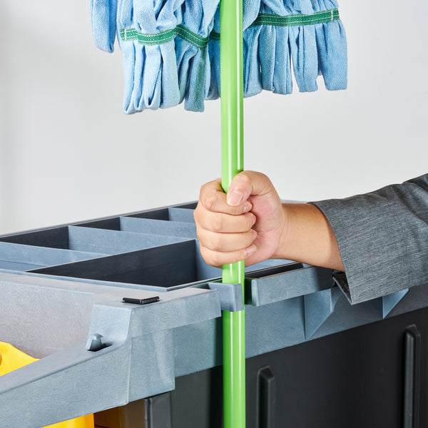 - 4-tiered shelves provide room for organizing and storing cleaning supplies and equipment