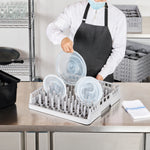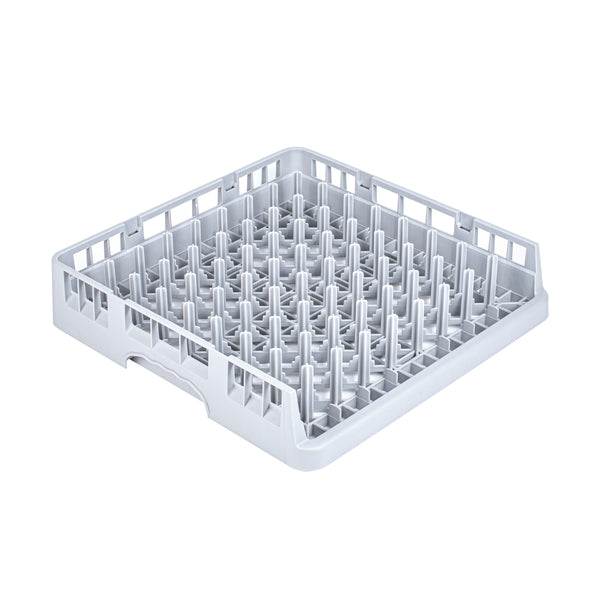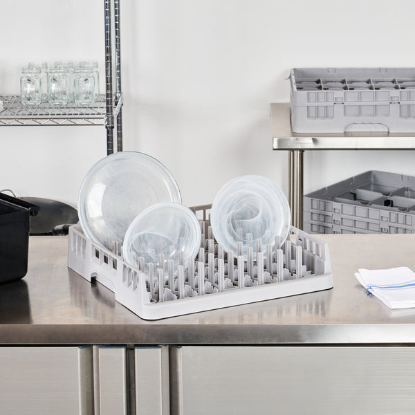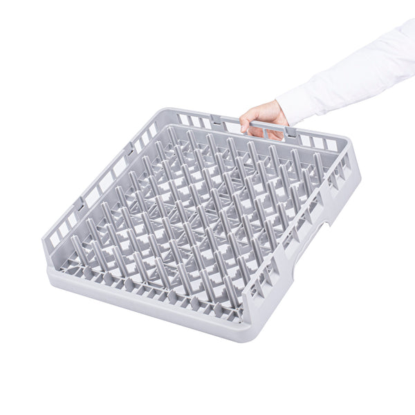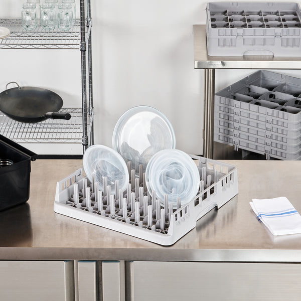 Elevate your commercial kitchen efficiency with our Clean Tek Professional Gray Peg Rack. The open end design of this commercial dish rack provides easy placement and removal of trays of all lengths. Each plastic peg rack is designed to accommodate standard plates in one direction and deep plates, bowls, and plate covers in the other during warewashing. This versatile peg rack, made from premium plastic, withstands daily use, ensuring long-lasting performance in your bustling restaurant. With open interior compartments, this plastic drying rack enhances cleaning, allowing every glass to sparkle effortlessly. This restaurant dishwasher rack features an easy-to-handle design, making it a practical choice for quick and safe loading and unloading. Measuring 19.69 inches in length by 19.69 inches in width by 3.98 inches in height, this plastic rack perfectly fits into your kitchen setup without compromising on space. Sold in a 1 count box.