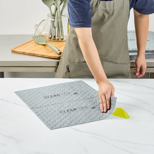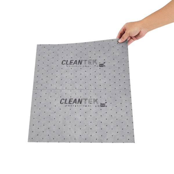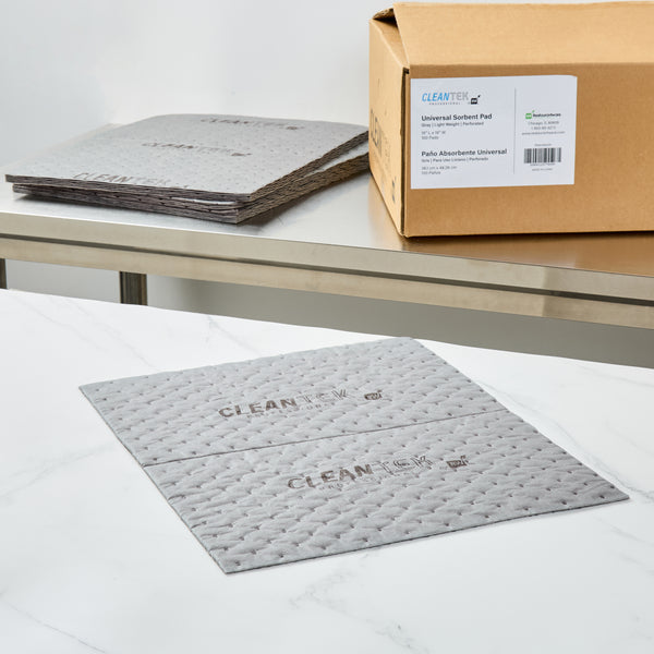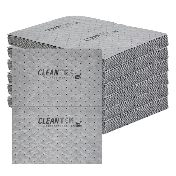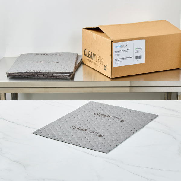 Ensure optimal spill management with versatile absorbent spill pads. Clean Tek Professional Absorbent Spill Pads effectively absorb all fluid types, including oils, coolants, solvents, and water, ensuring cleaner and safer workspaces. These oil absorbent pads are crafted from universal sorbent material, offering compatibility with harsh chemicals like hydrochloric acid, which supports safe handling in busy foodservice settings. Featuring a lightweight and perforated design, these spill cleanup pads allow for easy handling and precise application, reducing waste and improving operational efficiency. With generous dimensions of 14.9 inches by 18.8 inches, they provide ample coverage for spills, minimizing the number of pads needed and reducing overall costs. Perfect for commercial kitchens, food processing facilities, and catering events, these absorbent spill pads ensure prompt cleanup and maintain a professional appearance. Each order includes 100 Clean Tek Professional Absorbent Spill Pads.