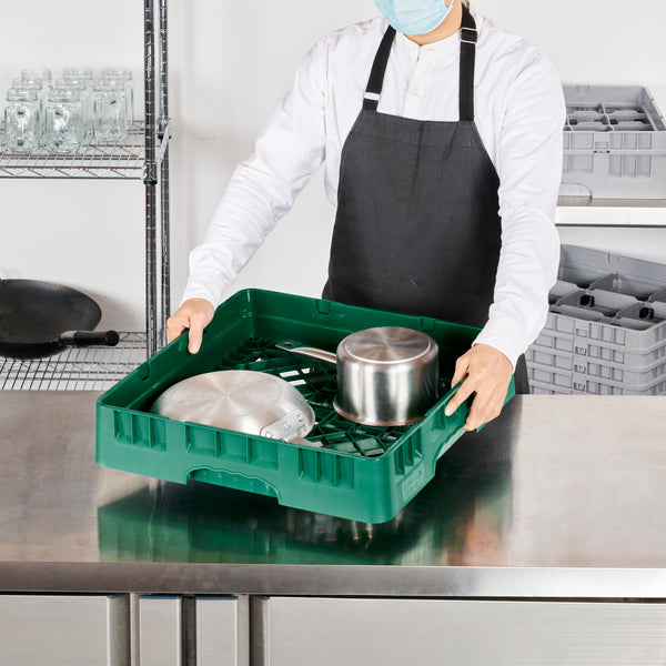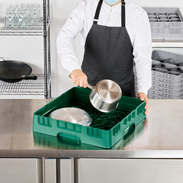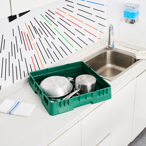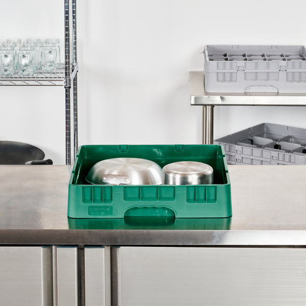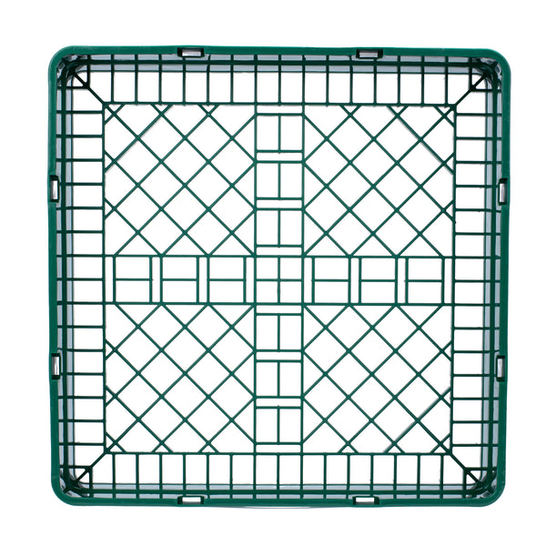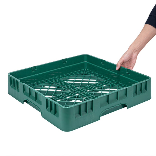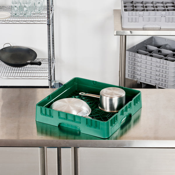 Enhance your workspace efficiency with the Clean Tek Professional Green Base Rack. The sturdy construction of this open base rack minimizes breakage, offering durability and long-lasting performance during cleaning and storage. This flatware base rack features closed outer walls to keep out contaminants and preserve the quality of your utensils. Designed with an open interior, this green base rack allows optimal airflow for quick drying and rinsing. Rounded handles on all four sides of this heavy-duty dish rack provide a secure grip for easy handling, making transport a breeze. Measuring 19.69 inches in length by 19.69 inches in width by 3.98 inches in height, this rack base fits seamlessly into your kitchen setup. Sold in a 1 count box.