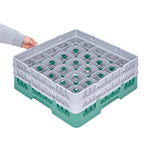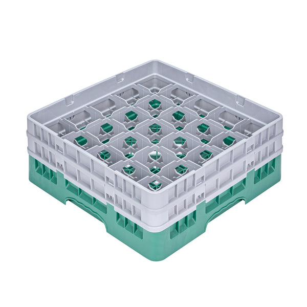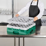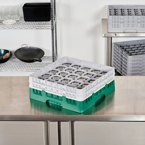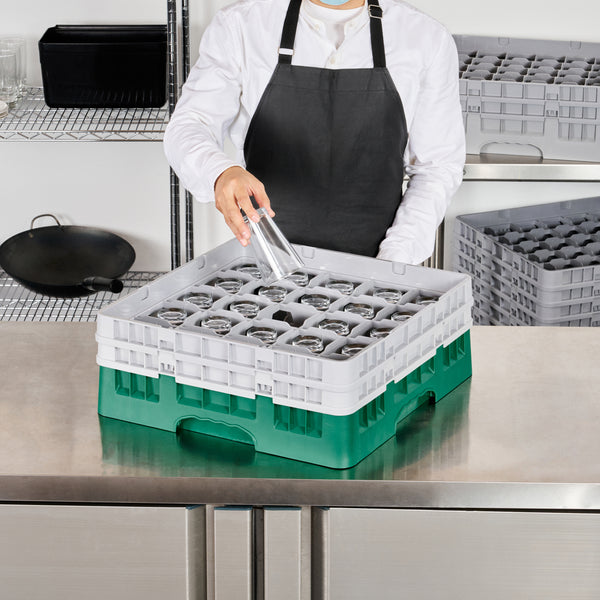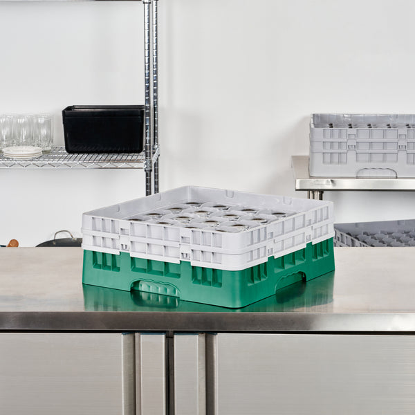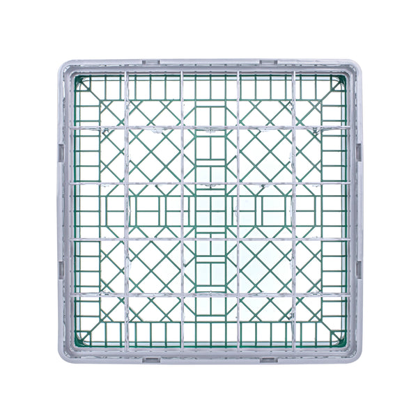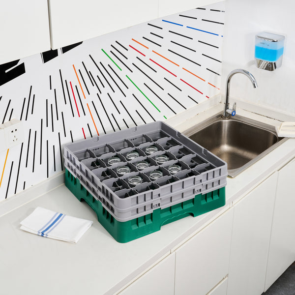 Optimize your glassware storage with our Clean Tek Professional Green Glass Rack. This dishwasher rack is designed with 25 compartments, ensuring each piece of glassware is securely held and protected. For added versatility, this compartment rack features 1 full drop extender and 1 half drop extender, catering to various glass heights. Made from durable PP, this barware organizer is built to withstand the rigors of commercial use. The easy-to-handle design of this glass rack allows for efficient transportation and storage. With open interior compartments, this commercial glass rack facilitates quick drying and cleanliness. Solid external walls provide robust support and stability, keeping your glassware safe. Measuring 19.69 inches in length by 19.69 inches in width by 7.24 inches in height, this dishwasher rack offers ample space for all your barware needs. Sold in a 1 count box.