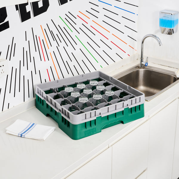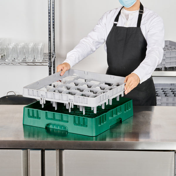 Our Clean Tek Professional Green Glass Rack offers unparalleled glassware storage solutions for your foodservice establishment. This durable commercial glass rack features 25 compartments, ensuring your glassware remains organized and secure. The dishwasher rack design includes a full drop extender, making it easy to accommodate various glass sizes. With an easy-to-handle design, this rack simplifies the process of transporting and storing glassware. Their compartment rack layout boasts open interior compartments, allowing for optimal water and air circulation during the cleaning process. Solid external walls provide added protection, ensuring your barware organizer withstands the rigors of daily use. This glass rack, crafted from durable PP, guarantees long-lasting performance and resilience. Measuring 19.69 inches in length by 19.69 inches in width by 5.63 inches in height, this rack is perfectly sized to fit your commercial needs. Sold in a 1 count box.