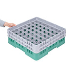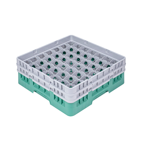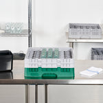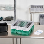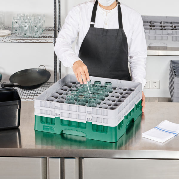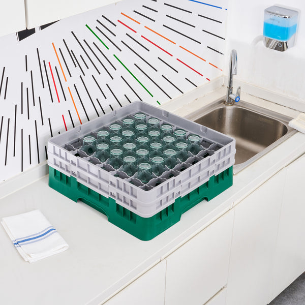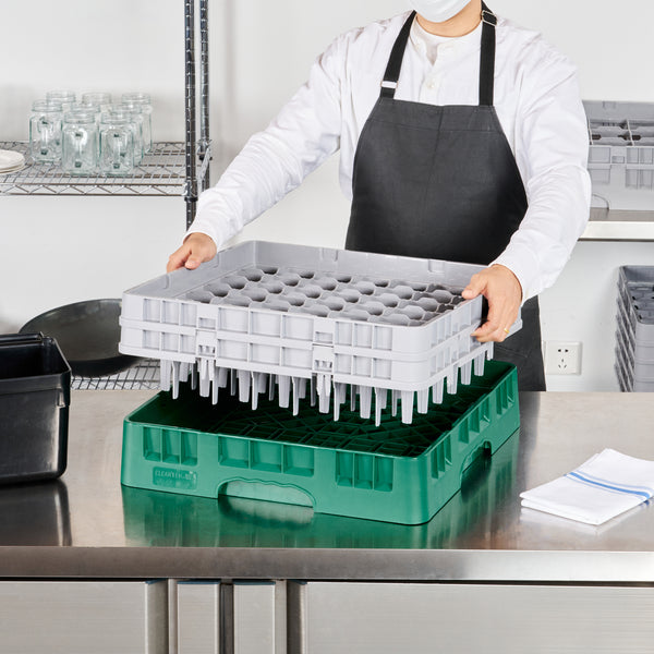 Efficiently organize and protect your glassware with our Clean Tek Professional Green Glass Rack. This commercial glass rack features 49 compartments, providing ample space for all your glassware storage needs. Designed with a durable PP construction, this dishwasher rack ensures long-lasting use even in the busiest kitchens. With an easy-to-handle design, this compartment rack makes transporting glassware a breeze. The open interior compartments allow for thorough cleaning and drying, while the solid external walls offer extra protection during transit. Equipped with a full drop extender and a half drop extender, this barware organizer adapts to various glass sizes. Measuring 19.69 inches in length by 19.69 inches in width by 7.24 inches in height, this rack efficiently fits into standard dishwasher units. Sold in a 1 count box.