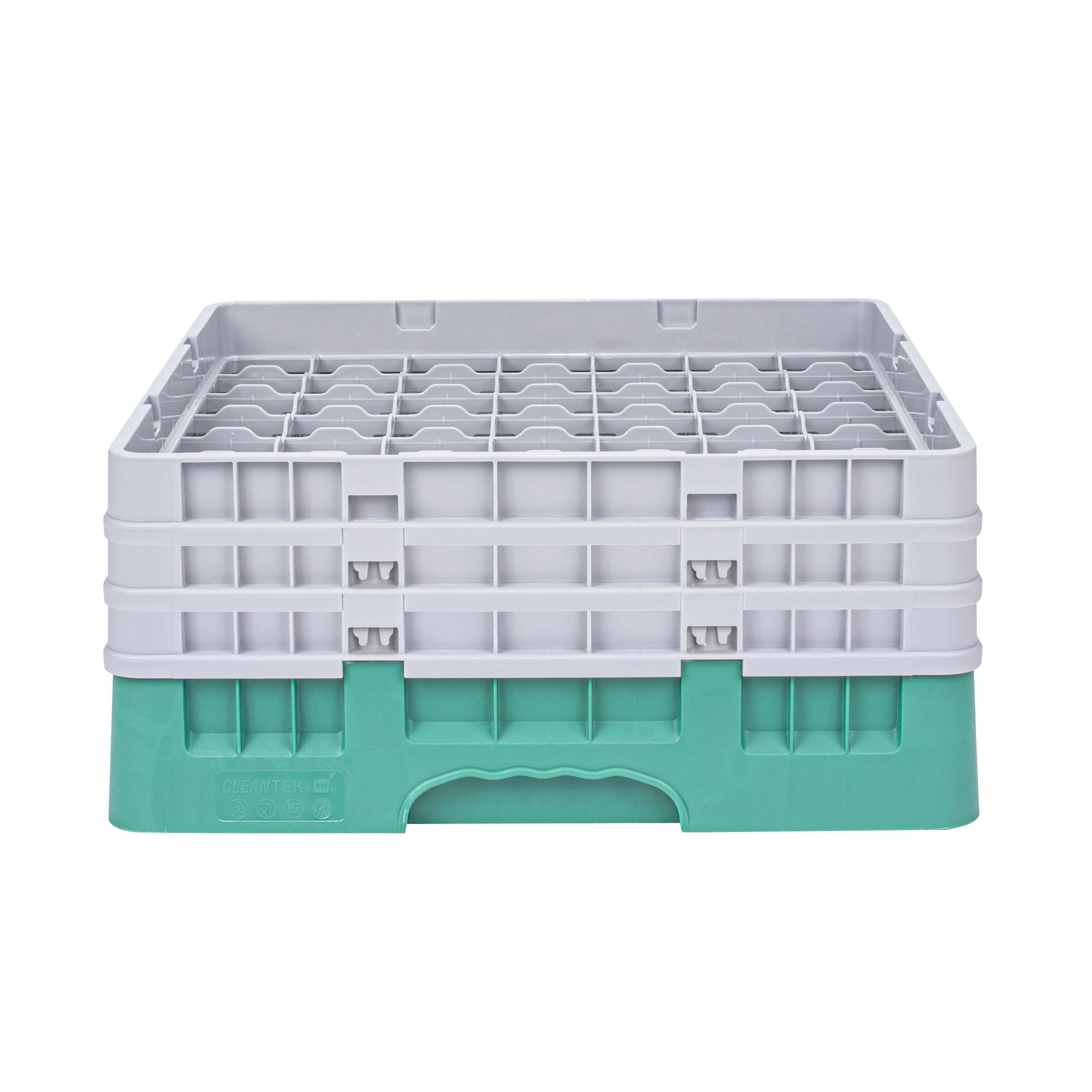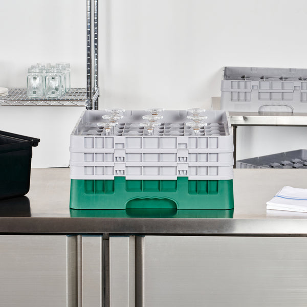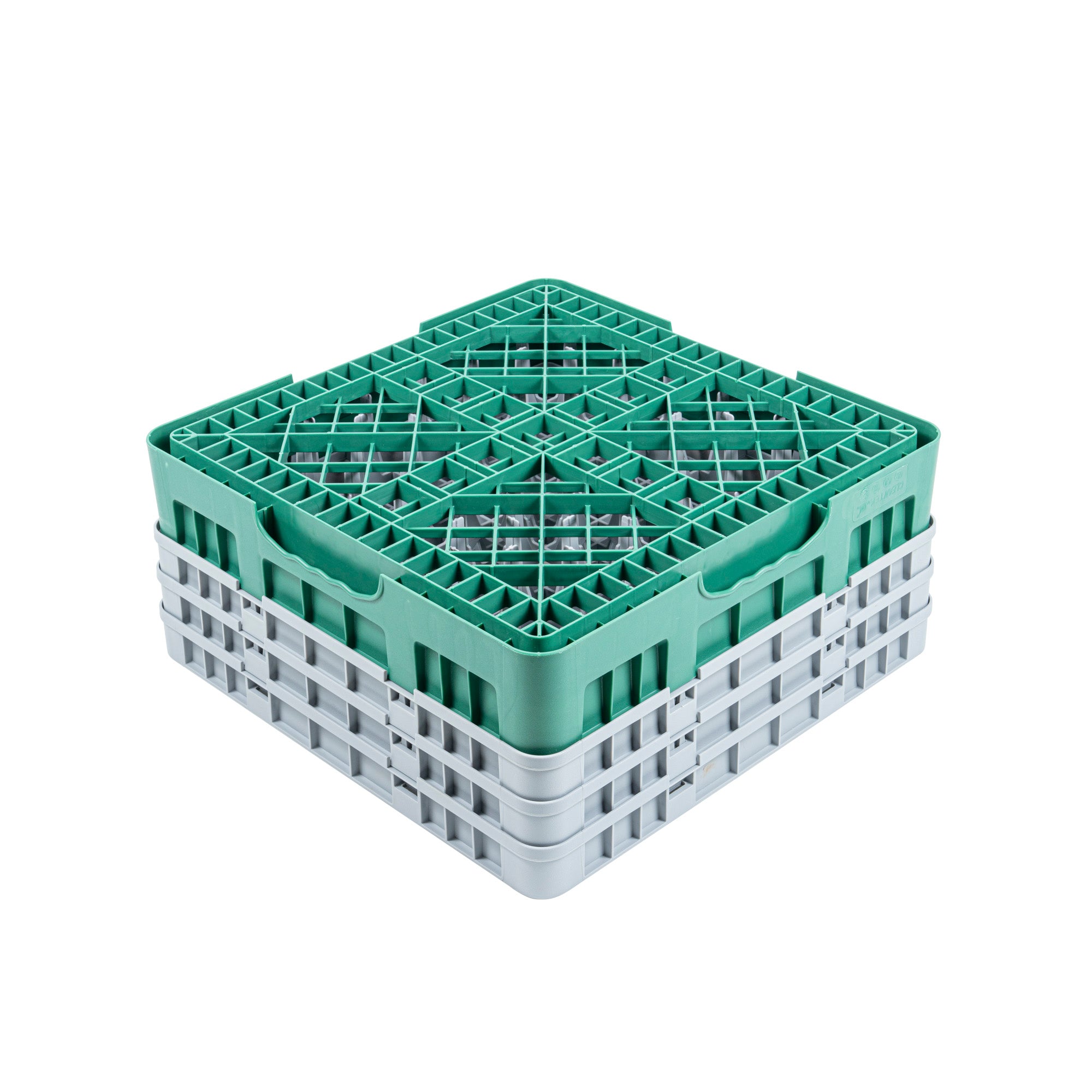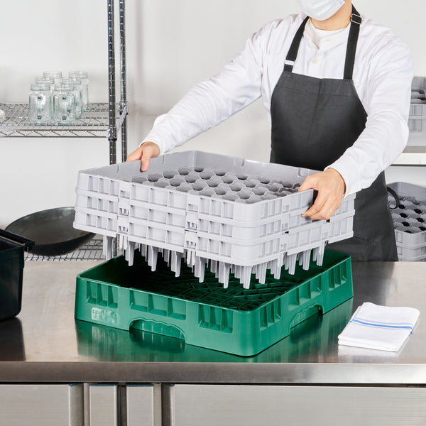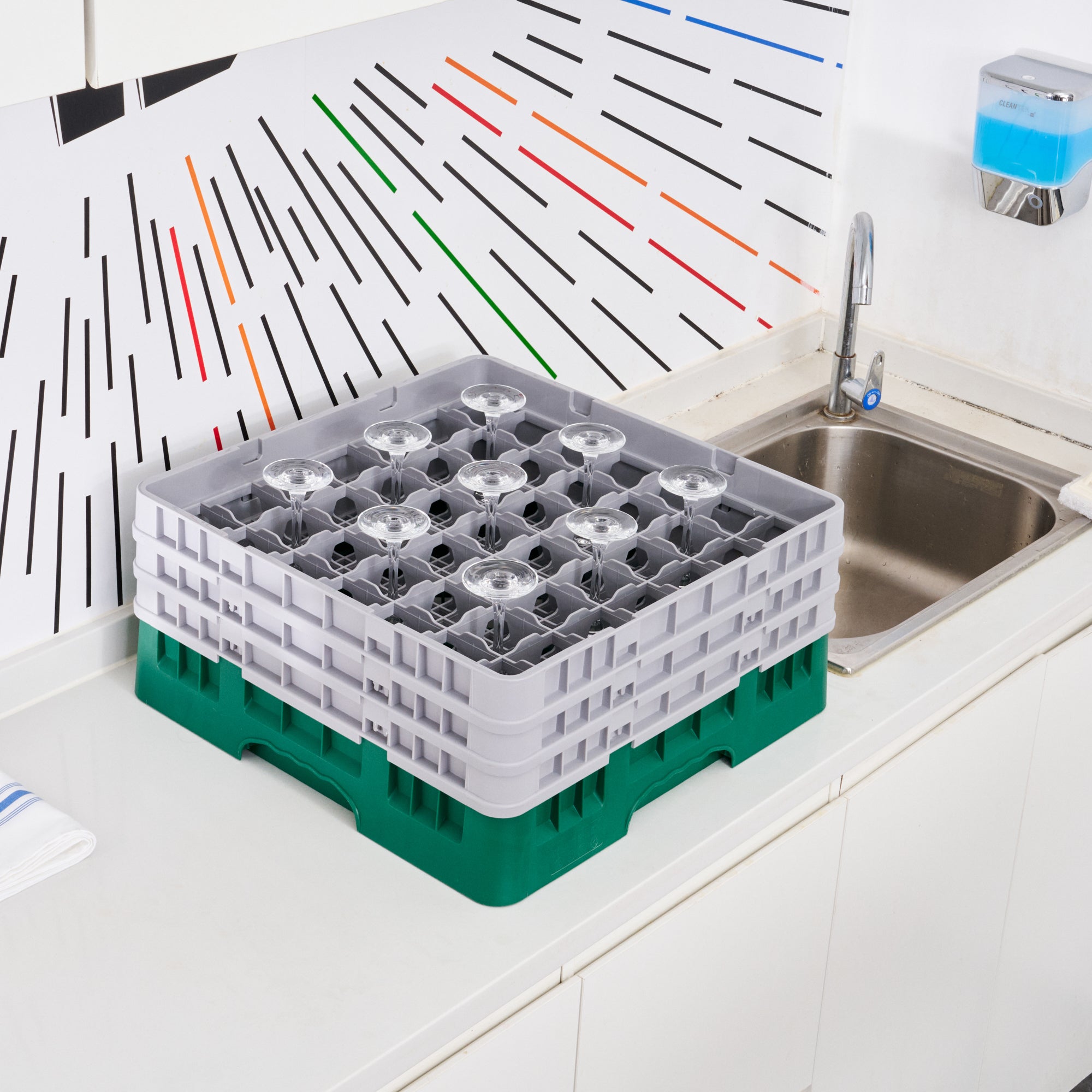 Optimize your barware storage with our Clean Tek Professional Green Glass Rack. Featuring 49 compartments, this commercial glass rack is perfect for organizing glassware in busy kitchens and bars. This dishwasher rack includes a full drop extender and two half drop extenders for versatile stacking options. Crafted with durable PP material, this compartment rack is built to withstand heavy use. The easy-to-handle design ensures efficient loading and unloading of glassware. With open interior compartments, this barware organizer allows for thorough cleaning and quick drying. Solid external walls provide added protection and stability during transport. Measuring 19.69 inches in length by 19.69 inches in width by 8.86 inches in height, this glassware storage solution fits seamlessly into any commercial dishwasher setup. Sold in a 1 count box.