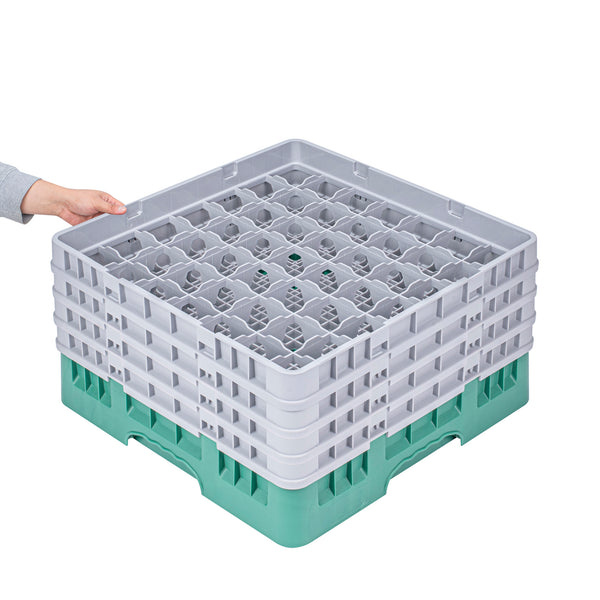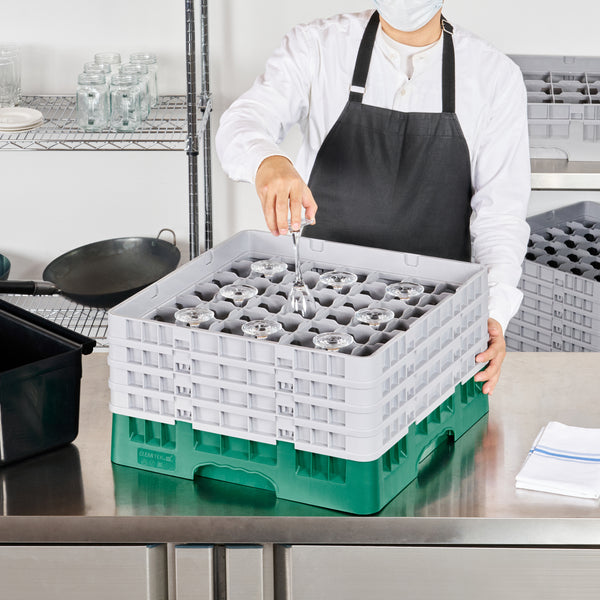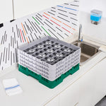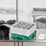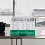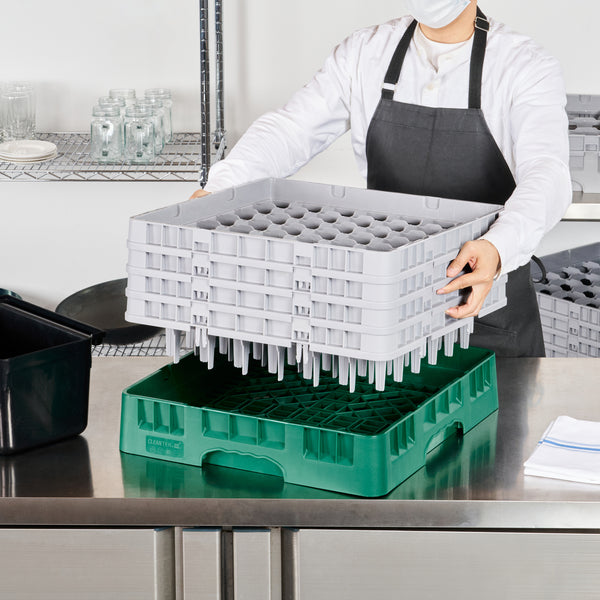 Our Clean Tek Professional Green Glass Rack is the ultimate solution for efficient glassware storage in any busy kitchen. This commercial glass rack features 49 compartments, ensuring each piece of glassware is securely held and protected. With a full drop extender, this dishwasher rack provides additional height to accommodate taller glasses. Designed with three half drop extenders, this compartment rack offers flexibility for various glass sizes and shapes. Constructed from durable PP, this barware organizer are built to withstand the rigors of daily use. The easy-to-handle design of this glass rack makes transporting and loading them into dishwashers a breeze. Open interior compartments allow for thorough cleaning and drying, while the solid external walls provide added stability. Measuring 19.69 inches in length by 19.69 inches in width by 10.51 inches in height, this glass rack fit perfectly into standard commercial dishwashers. Sold in a 1 count box.