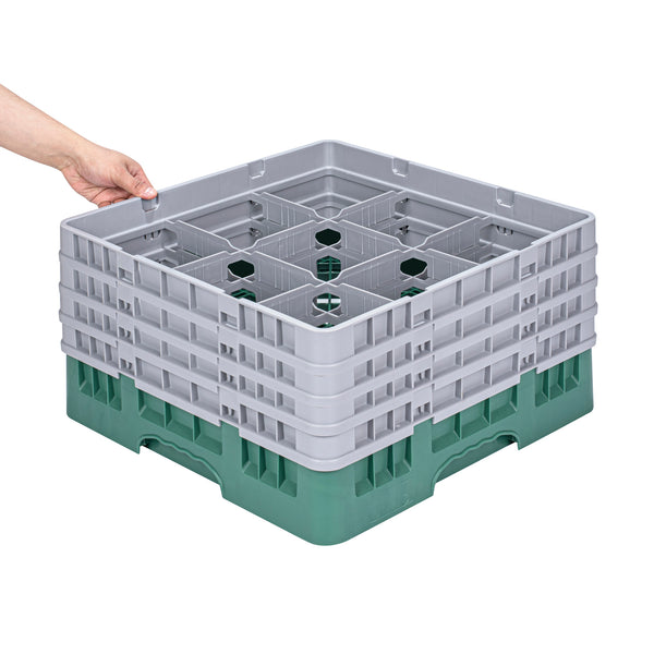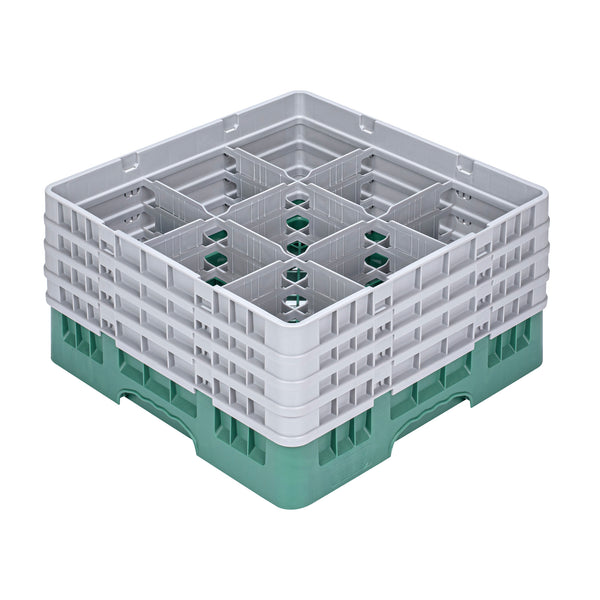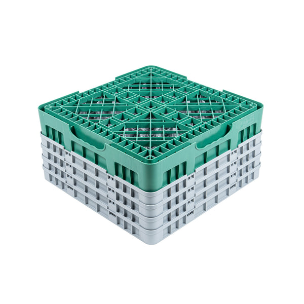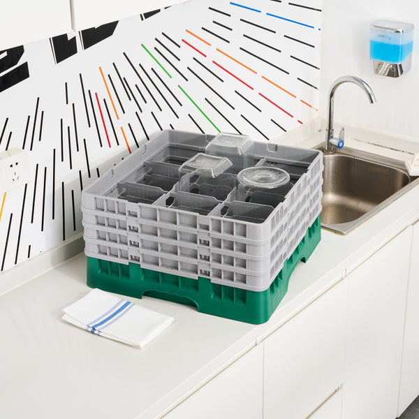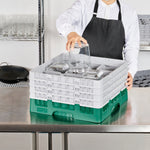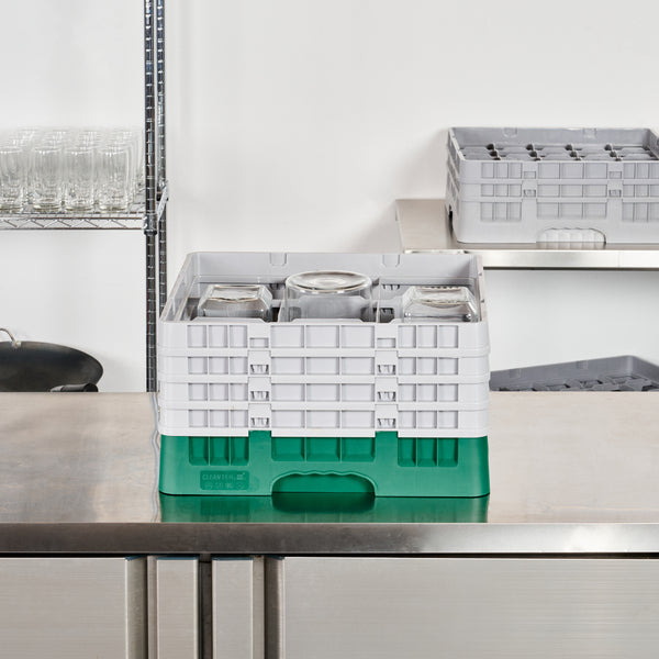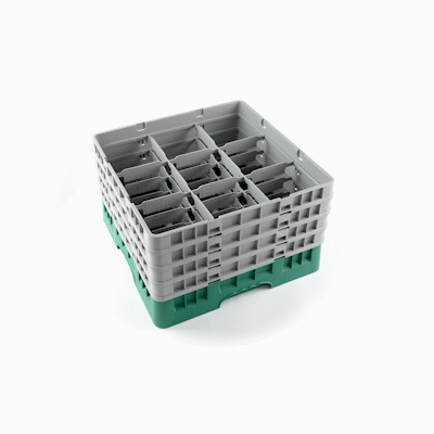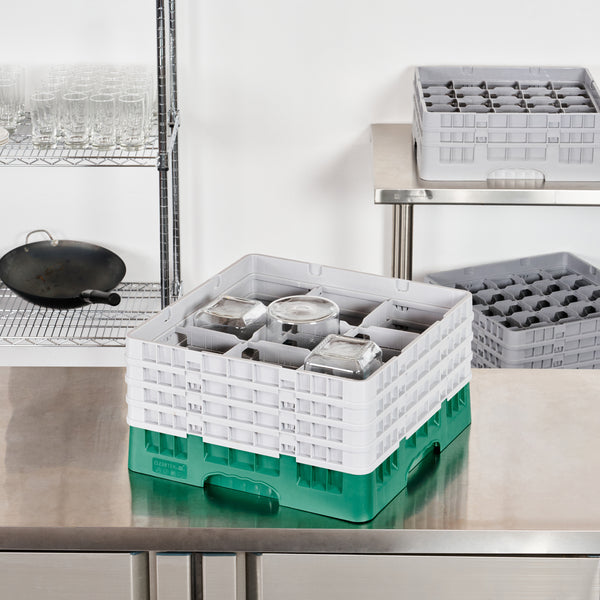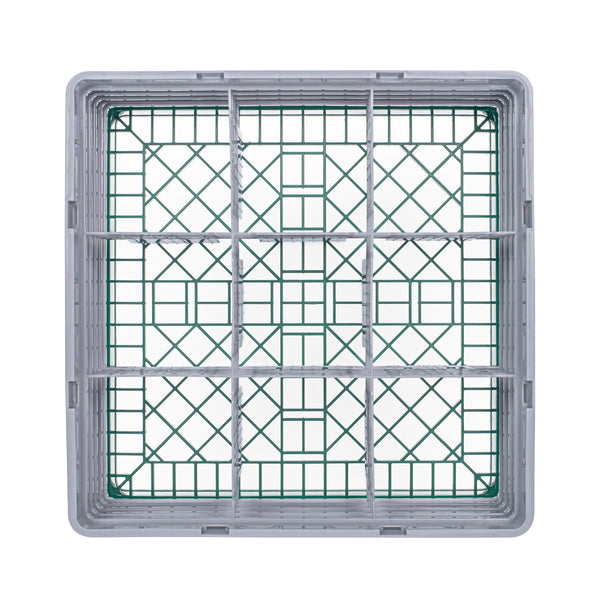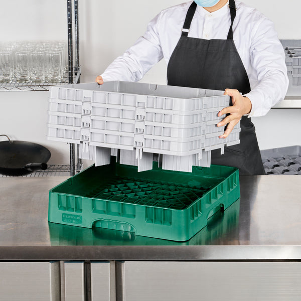 Optimize your glassware storage with our Clean Tek Professional Green Glass Rack. This dishwasher rack features 9 compartments to safely organize and clean your barware. Equipped with 1 full drop extender, this compartment rack easily accommodates taller glassware. Plus, the 3 half drop extenders provide versatile storage options for various glass sizes. Crafted from durable PP, this commercial glass rack is built to withstand the demands of busy kitchens and bars. Designed with an easy-to-handle structure, this barware organizer simplifies the process of loading and unloading. The open interior compartments allow for efficient water flow, ensuring a thorough cleaning. Solid external walls protect your glassware from breakage and damage during washing cycles. Measuring 19.69 inches in length by 19.69 inches in width by 10.51 inches in height, this dishwasher rack fits seamlessly into most commercial dishwashing systems. Sold in a 1 count box.