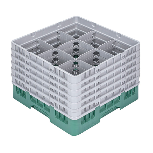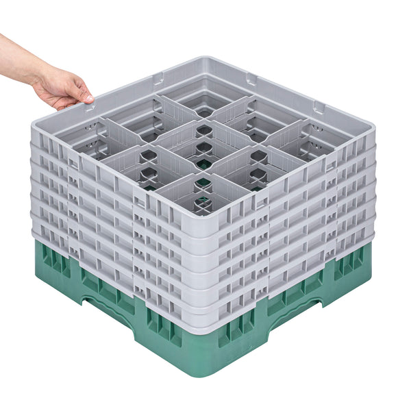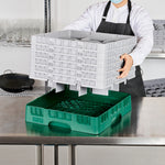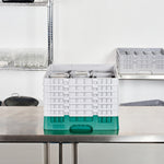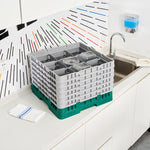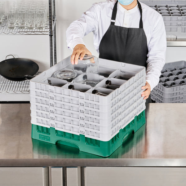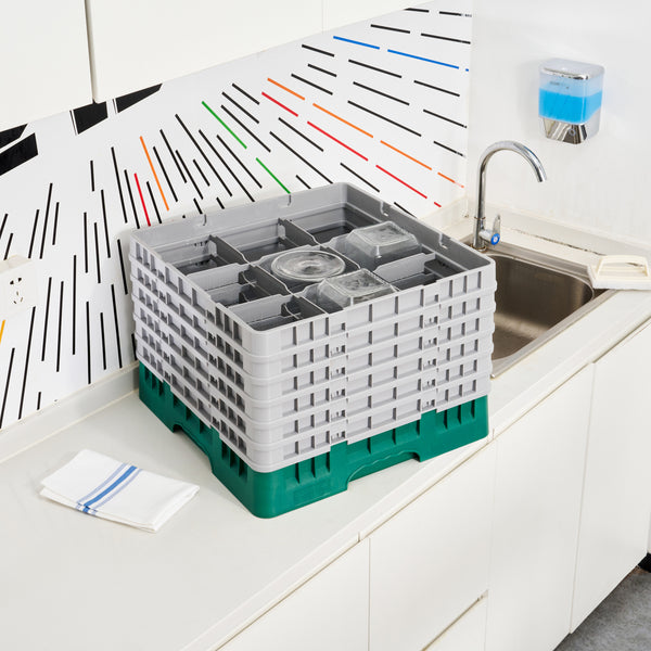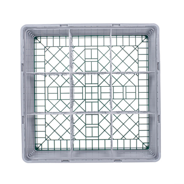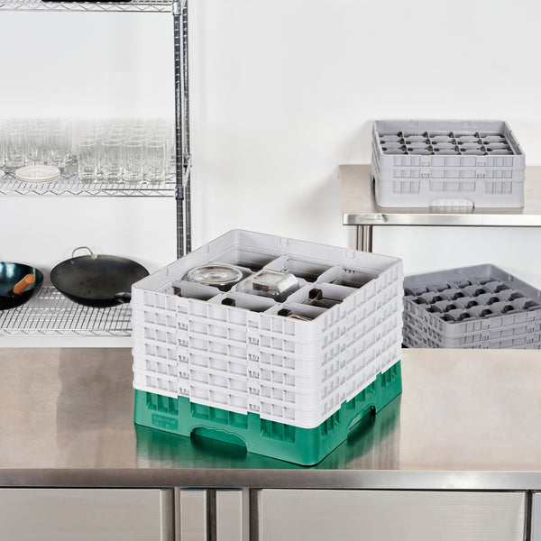 Optimize your glassware storage solutions with our Clean Tek Professional Green Glass Rack. This commercial glass rack features 9 compartments to securely hold and organize your glassware. Designed with a 1 full drop extender, this dishwasher rack easily accommodates taller glass items. The 5 half drop extenders included with this rack offer versatility in storing various sizes of barware. Made from durable PP, this glassware storage solution ensures long-lasting use in busy settings. With an easy-to-handle design, this compartment rack simplifies the process of loading and unloading glasses. The open interior compartments allow for efficient water flow during washing cycles. Meanwhile, the solid external walls of this barware organizer provide additional protection and stability. Measuring 19.69 inches in length by 19.69 inches in width by 13.74 inches in height, this commercial glass rack fits seamlessly into most commercial dishwashers. Sold in a 1 count box.