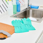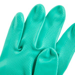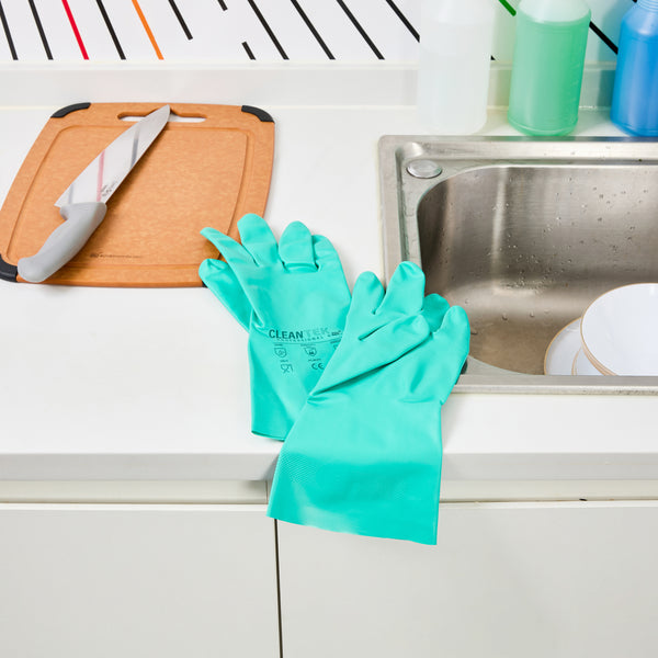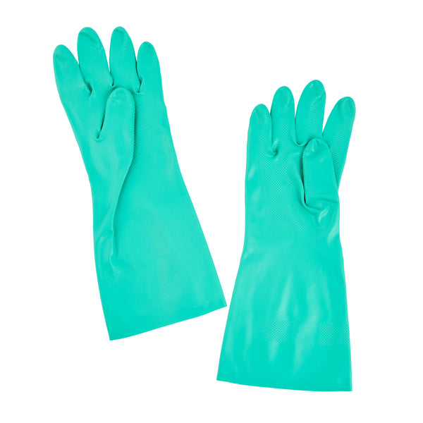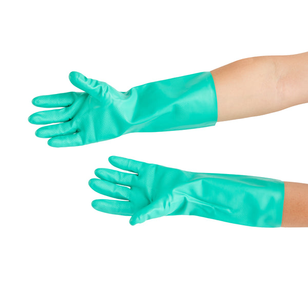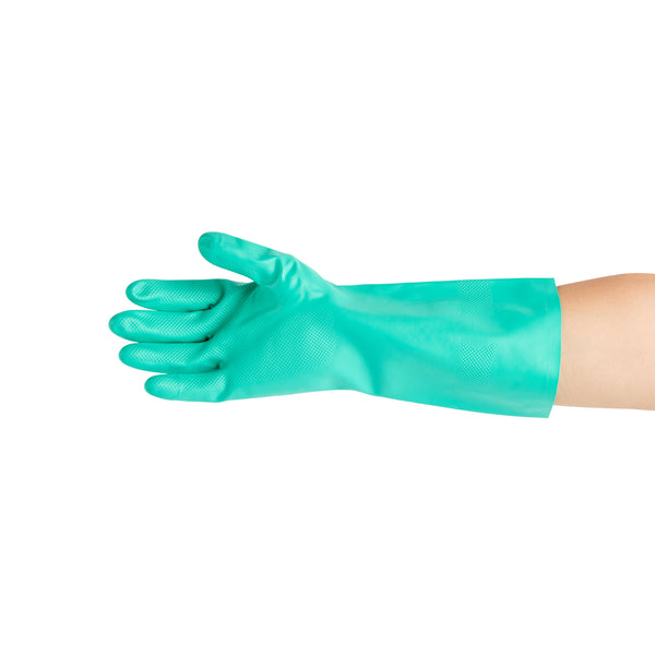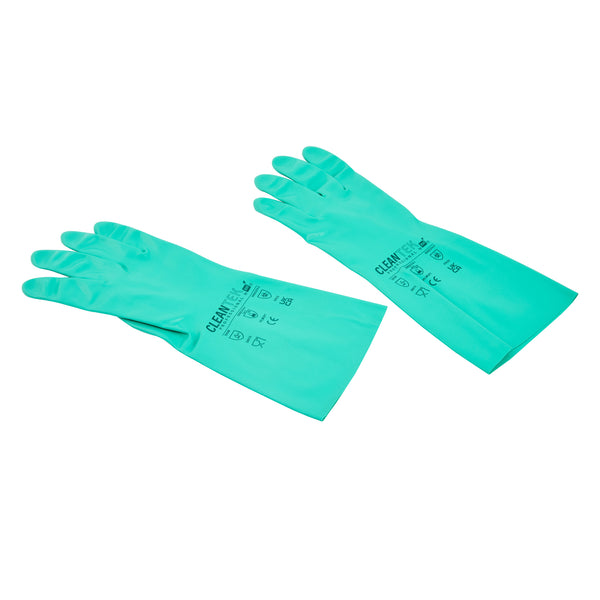 Ensure safe and efficient food handling with chemical-resistant gloves. Clean Tek Professional Green Nitrile Gloves provide a durable 15-mil thickness that ensures exceptional hand protection during tough cleaning tasks, making them indispensable for any foodservice operation. The flock lining in these green nitrile gloves offers added comfort and keeps hands dry, even during prolonged use, enhancing your staff's productivity. With a long cuff design, these heavy-duty nitrile gloves effectively shield wrists and forearms from liquids and debris, ensuring comprehensive safety in kitchen environments. Measuring 13 inches in length, these gloves are made from nitrile, a chemical-resistant material that provides a reliable barrier against a variety of chemicals, safeguarding your team during food preparation and cleaning duties. Invest in these versatile gloves to enhance safety and hygiene in your establishment. Each order includes 10 Pairs of Clean Tek Professional Green Nitrile Gloves.