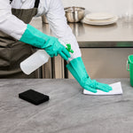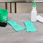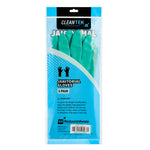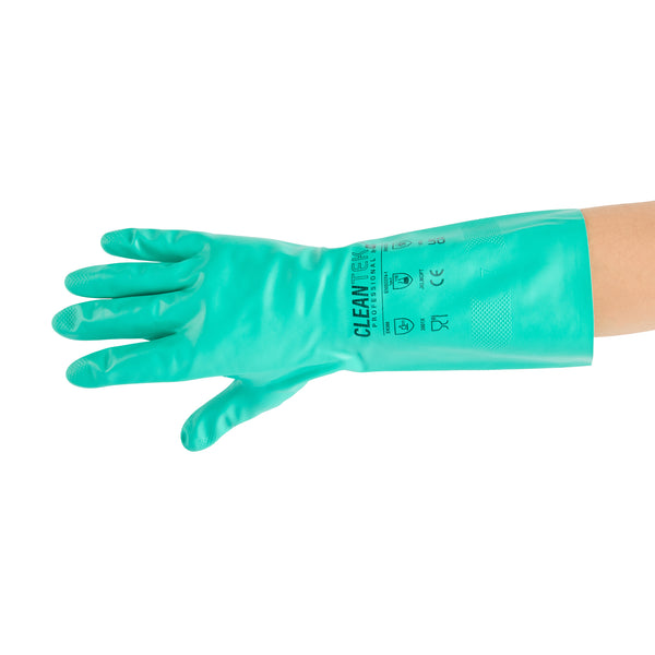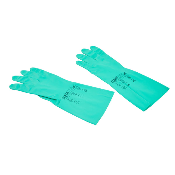 Ensure safety and comfort during cleaning tasks with reliable protection. Clean Tek Professional Chemical-Resistant Nitrile Gloves offer a durable 15-mil thickness that ensures hand protection during tough tasks, making them the ideal nitrile gloves for demanding environments. The chemical-resistant gloves are flock-lined to add comfort and keep hands dry for long wear, reducing hand fatigue for professionals who need to wear dishwashing gloves for extended periods. Designed with a long cuff, these gloves protect wrists and forearms from spills and debris, providing an added layer of security in commercial kitchens. Measuring 13 inches in length and 4 1/4 inches in width, these medium-sized gloves provide a snug fit, enhancing dexterity and grip. Made from high-quality nitrile material, these gloves are perfect for handling a variety of chemicals safely. Each order includes 1 Pair of Clean Tek Professional Chemical-Resistant Nitrile Gloves.
