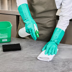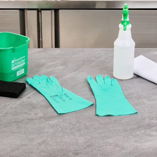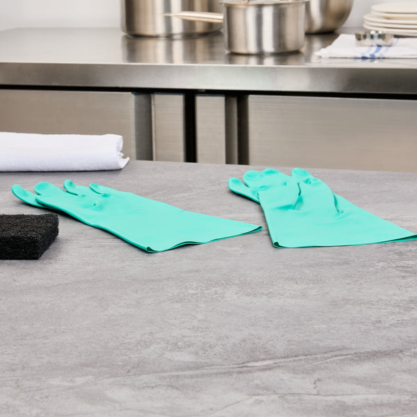 Safeguard your hands with superior protection against chemicals. Clean Tek Professional Green Rubber Chemical Resistant Gloves offer chemical resistance to ensure safety when working with cleaning chemicals, making them essential for maintaining hygiene in foodservice environments. These latex-free gloves eliminate the risk of allergic reactions, providing peace of mind for users with latex sensitivities. With a flocked grip, these gloves enhance handling in wet conditions, improving efficiency during food prep or cleaning tasks. The longer cuff design, measuring 12.99 inches, effectively shields wrists from splashes and spills, providing additional protection in fast-paced kitchens. Made from durable rubber, these gloves deliver high durability, ensuring they withstand the rigors of daily use. Equip your staff with these heavy-duty nitrile gloves to enhance workplace safety and performance. Each order includes 10 Clean Tek Professional Green Rubber Chemical Resistant Gloves.