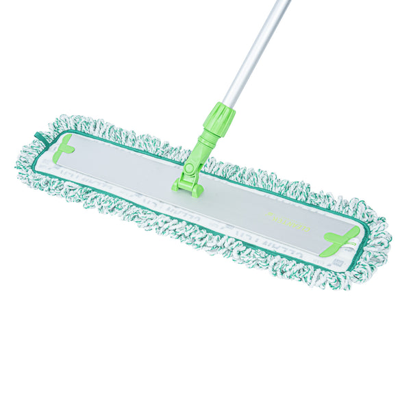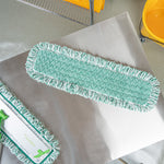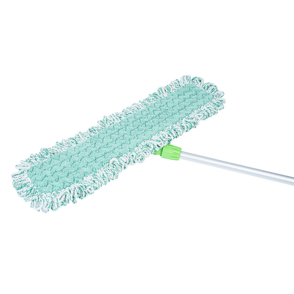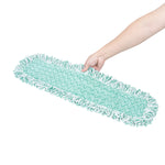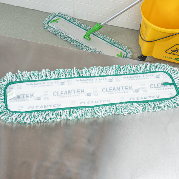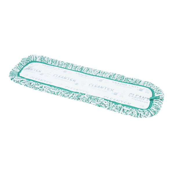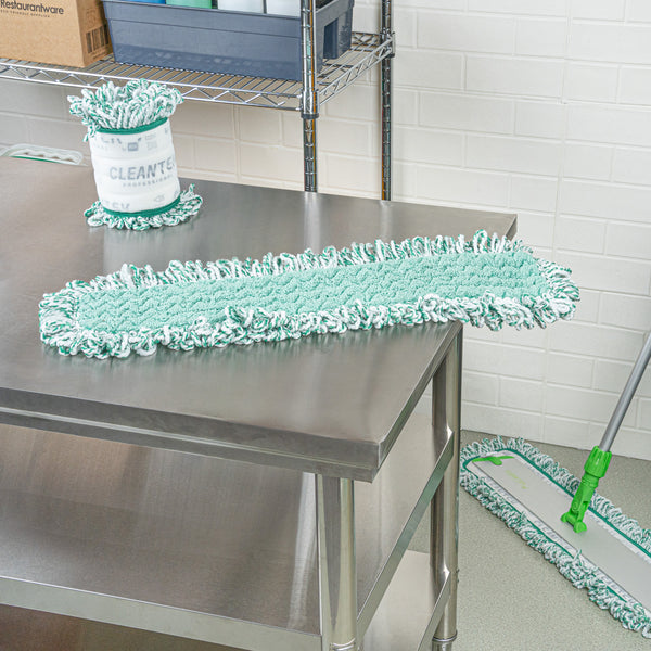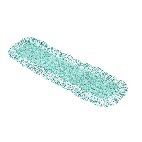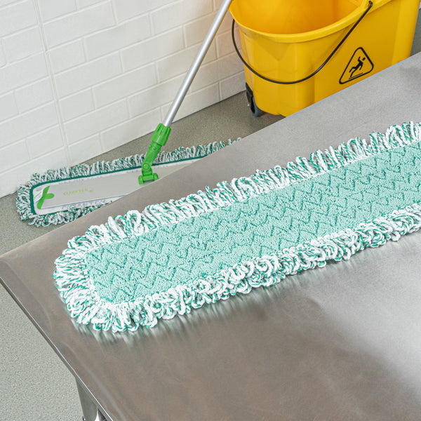 Enhance your cleaning efficiency with our Clean Tek Professional Green Microfiber Fringed Dust Mop Pad, designed to tackle the toughest cleaning tasks. Featuring a zigzag pattern, this mop pad maximizes contact area to capture and hold more dirt, dust, and debris. Ideal for pairing with their matching mop frame (SKU: RWT1752G) and handle (SKU: RWT1753G), this reusable mop pad creates an all-in-one cleaning solution that delivers excellent results. The fringes on this microfiber mop pad extend its reach, allowing you to clean around obstacles and into hard-to-reach areas effortlessly. Featuring a hook-and-loop backing, this dry mop pad ensures secure placement and prevents slippage during use. Sporting a green color, this dust mop pad can be used for color-coordinating cleaning tasks. Measuring 28.25 inches in length by 9 inches in width, this microfiber pad is perfect for covering large surface areas efficiently. Sold in a 1 count box. Mop frame and handle are available and sold separately.