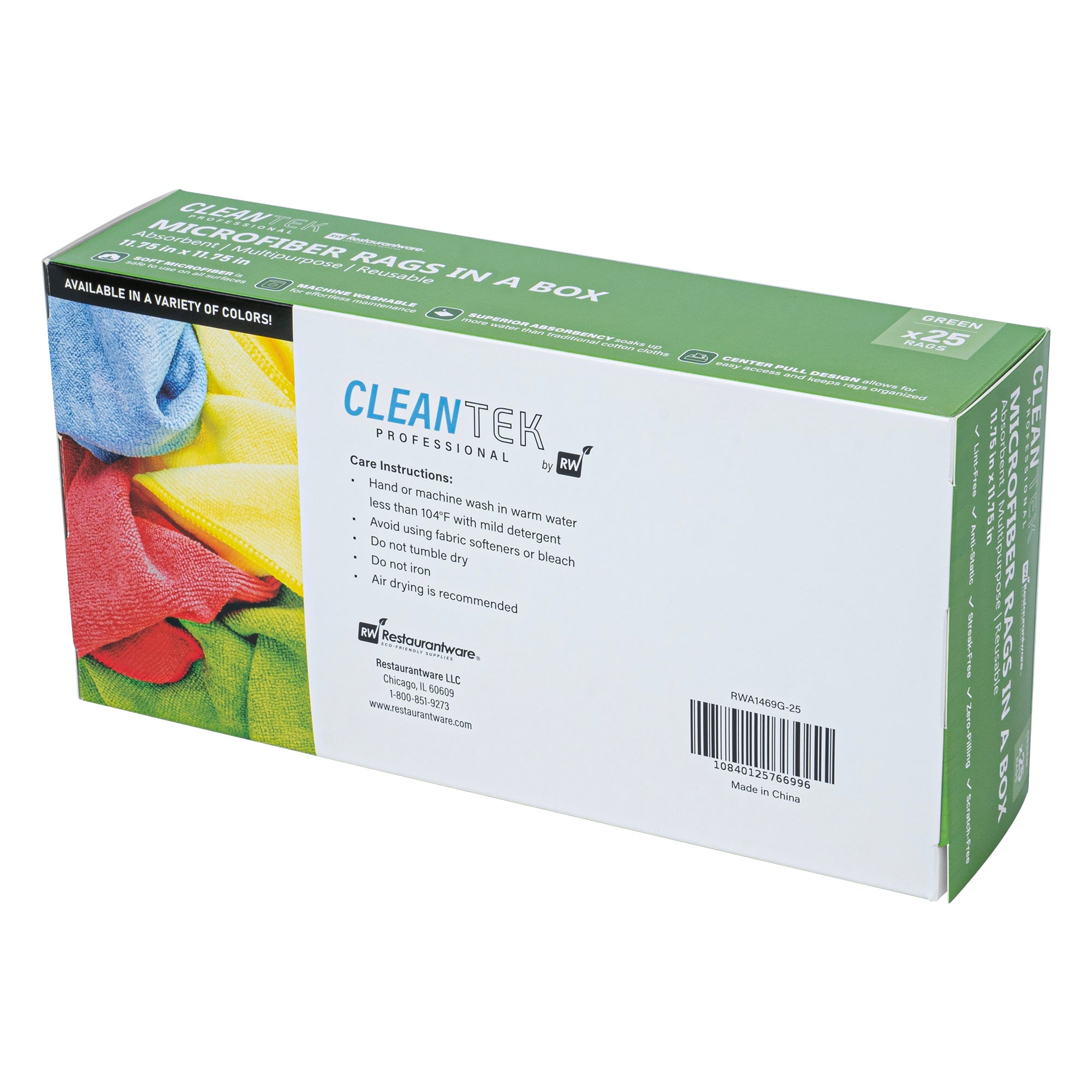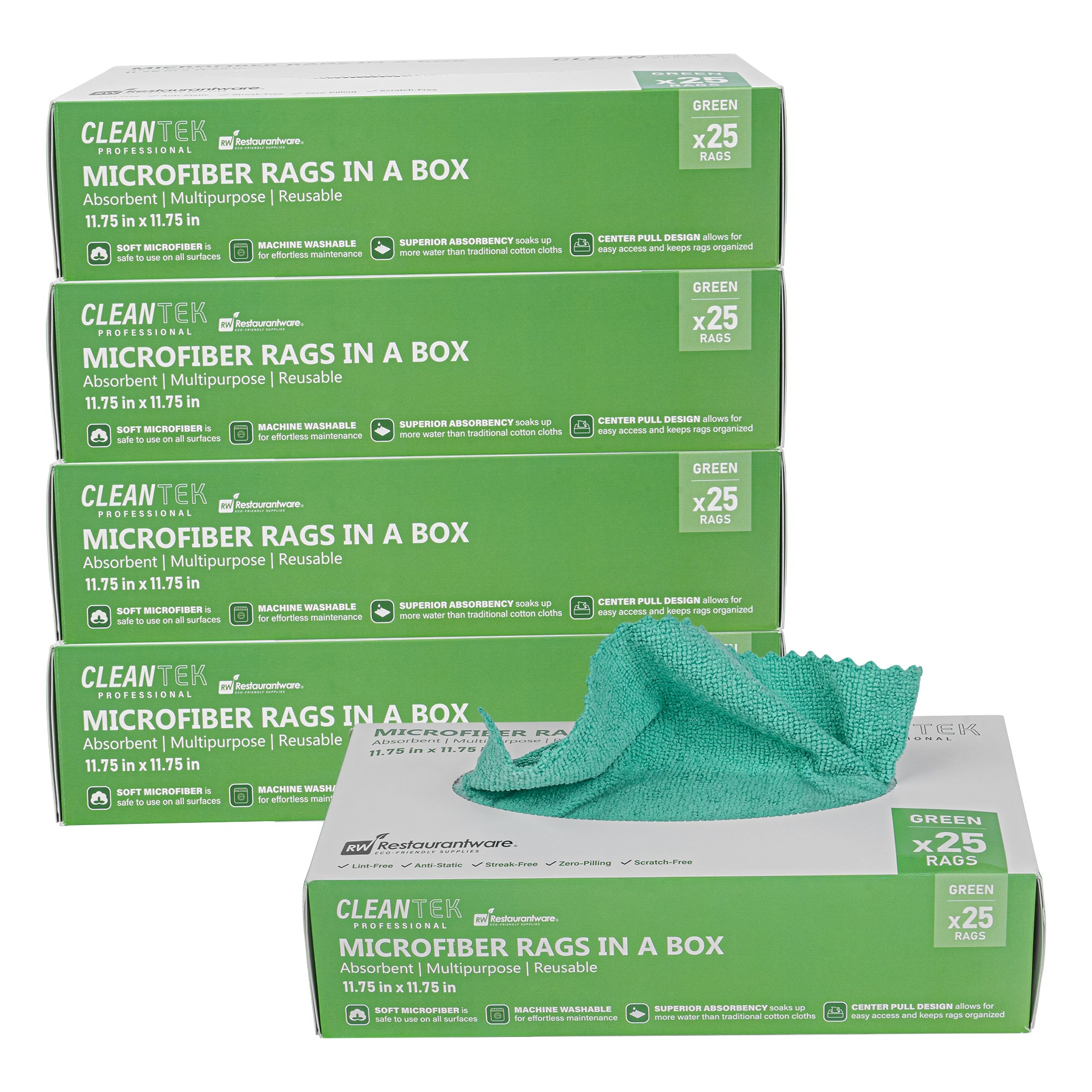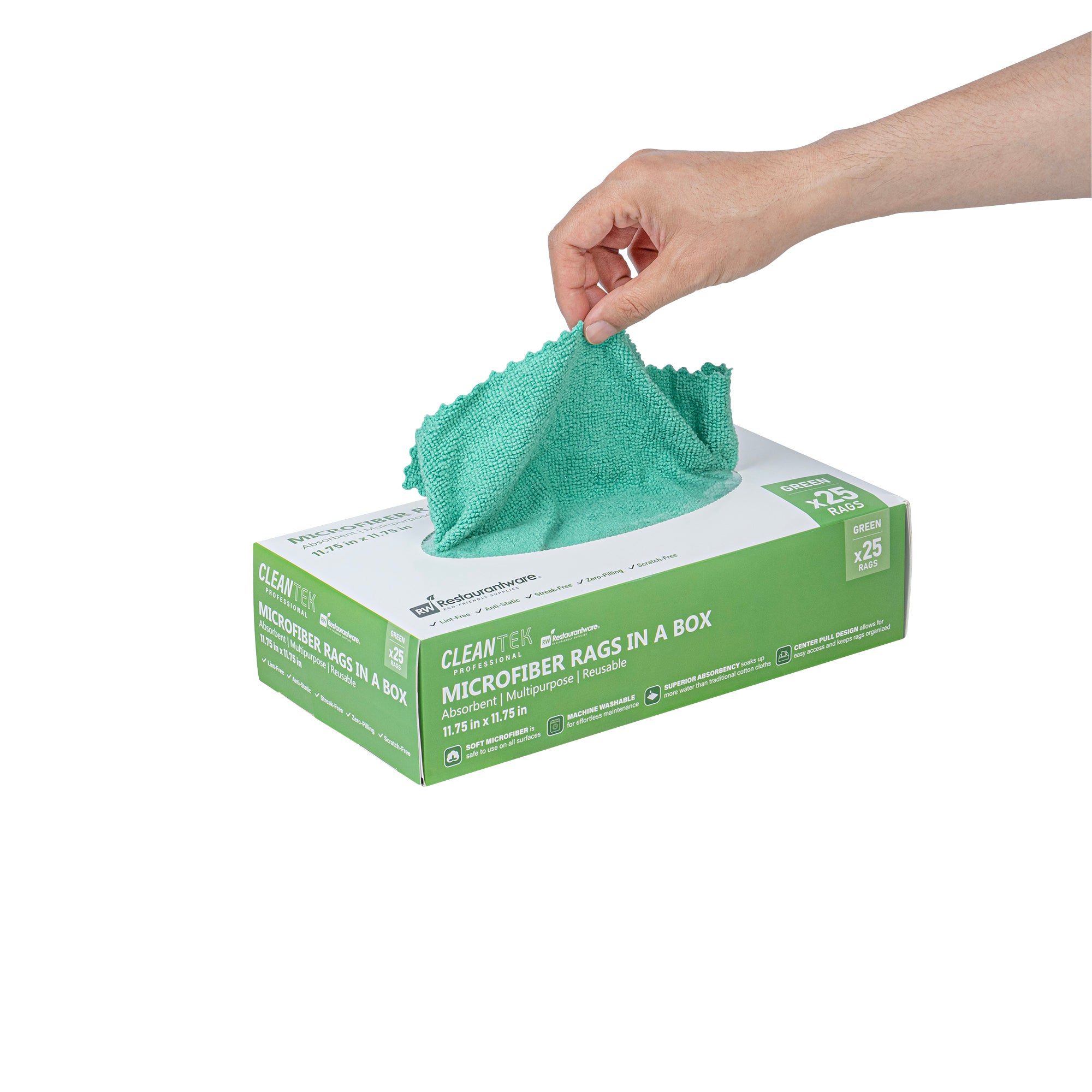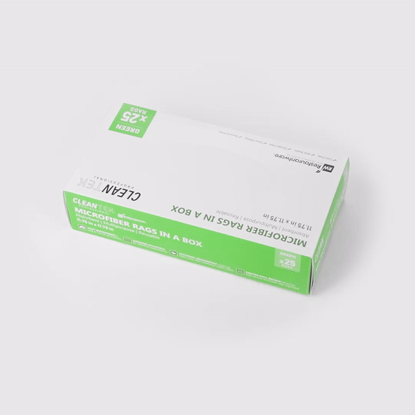 Revolutionize your cleaning routine with our Clean Tek Professional Green Microfiber Rags In A Box. These microfiber cloths come packaged in a dispenser box, allowing for easy dispensing and quick access, making them perfect for various cleaning tasks. Crafted from a blend of polyester and polyamide microfibers, these cleaning rags are durable and ensure you can thoroughly clean windows without leaving streaks. These microfiber towels are highly absorbent and effortlessly tackle spills and dry surfaces without any streaks. Designed for versatility, these microfiber rags are ideal for dusting, wiping surfaces, polishing, and absorbing spills. Featuring seamless wavy edges, these polishing cloths provide scratch-free cleaning, making them perfect for delicate surfaces and achieving a flawless finish. The green finish of these microfiber cleaning cloths facilitates easy identification, minimizing the risk of mix-ups and ensuring efficient use for specific tasks. Measuring 11.81 inches in length by 11.81 inches in width, these cleaning cloths offer ample coverage for various tasks. Each order includes 25 rags.