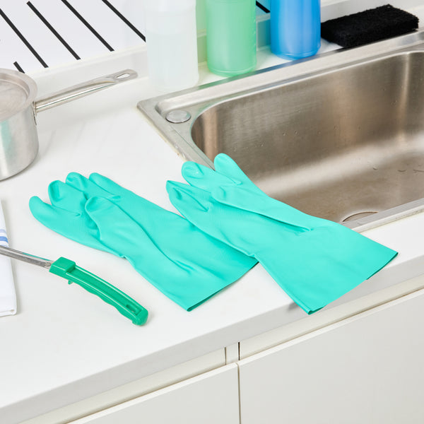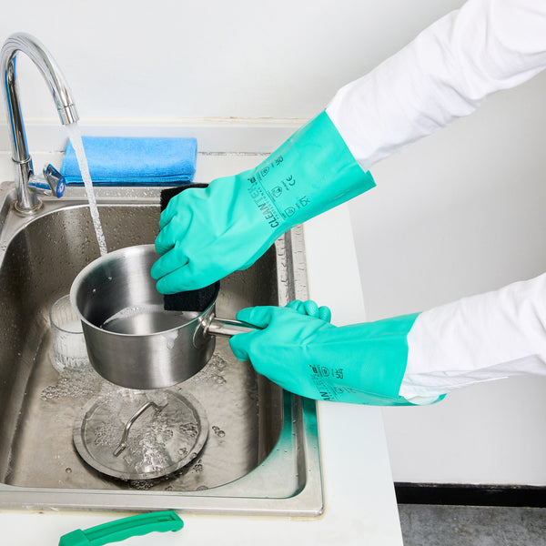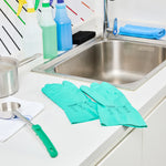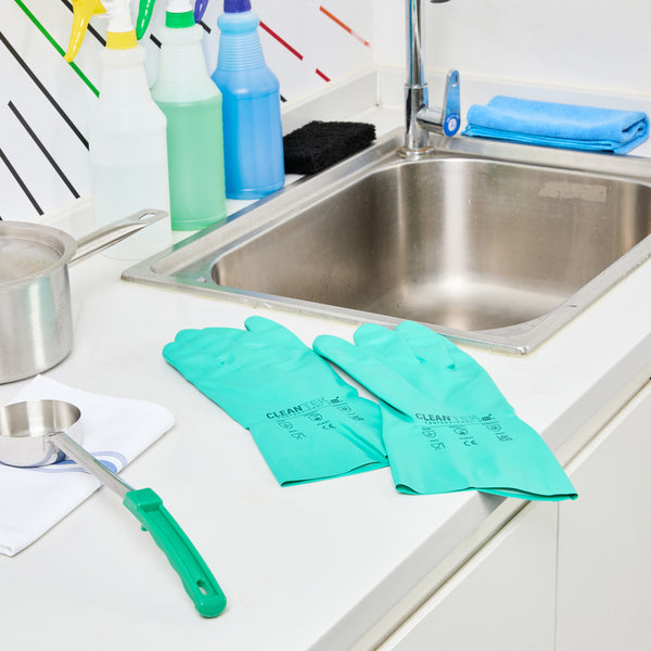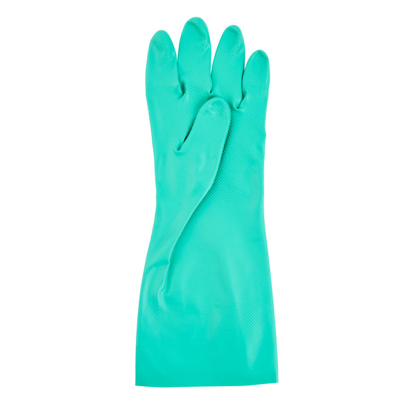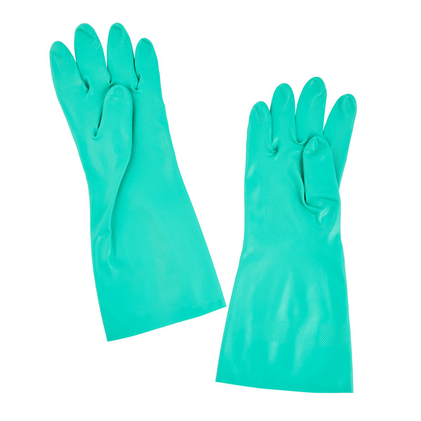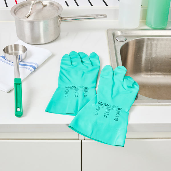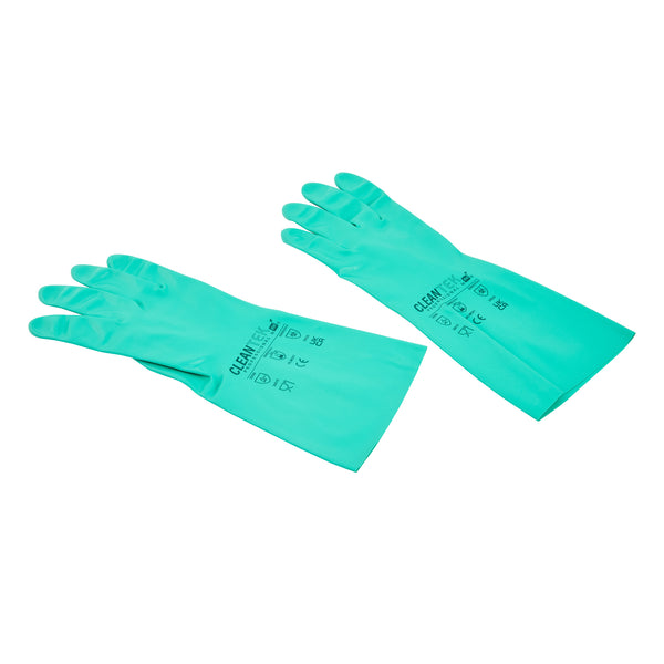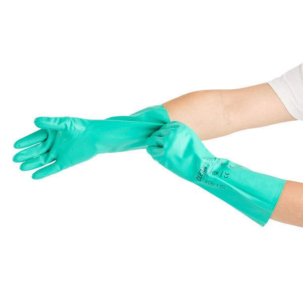 Enhance safety and efficiency with chemical-resistant gloves designed for the foodservice industry. Clean Tek Professional Green Nitrile Gloves are crafted from robust rubber, ensuring outstanding grip performance with a flocked lining for secure handling in wet conditions. These heavy-duty nitrile gloves feature a latex-free construction, effectively reducing allergy risks for your staff and creating a safer working environment. Their long cuffs provide enhanced chemical protection, guarding against potential hazards and making them indispensable for handling cleaners and sanitizers. With a length of 12.99 inches, these gloves offer excellent coverage. The gloves' EN374 Type A certification underscores their superior chemical resistance, a critical feature for high-durability tasks. Equip your team with gloves that combine safety and functionality. Each order includes 10 Clean Tek Professional Green Nitrile Gloves.