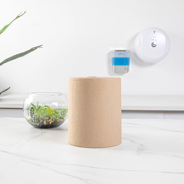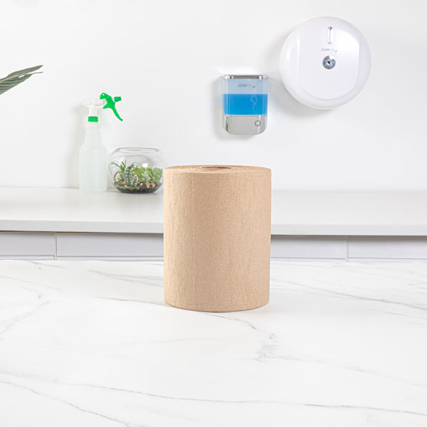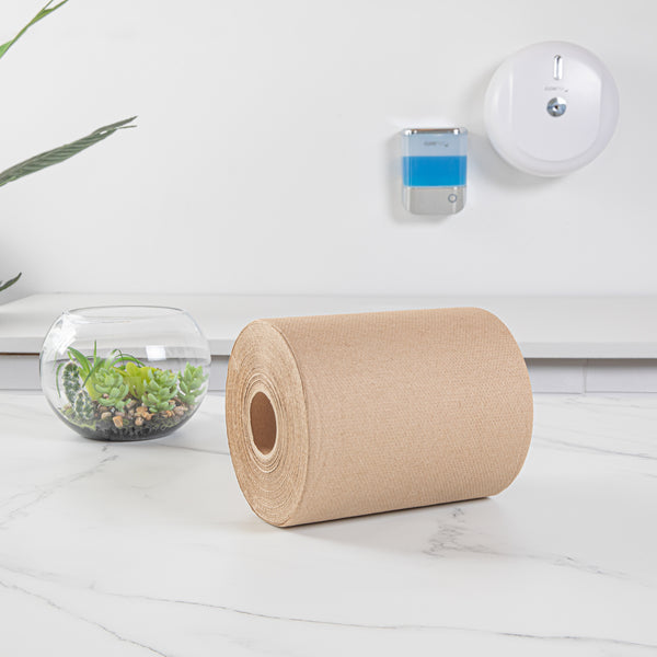 Provide your customers with a convenient way to dry their hands with our Clean Tek Professional Kraft Paper Towel Roll. Made using hardwound kraft paper, this 1-ply kitchen towel won't tear easily when wet, letting your guests use fewer paper towels per pull. Featuring an embossed texture, this disposable bathroom paper towel absorbs more water to dry hands faster. This kitchen tissue roll is non-perforated to help minimize waste by letting your patrons tear off just what they need. With a 2-inch universal core, this brown paper towel roll is compatible with our automatic paper towel dispensers (SKU: RWT1187B & SKU: RWT1188W). The 600-foot length of this hardwound paper towel roll minimizes the number of refills, making your employees' jobs simpler. Measuring 6.25 inches in diameter by 8 inches in width, this embossed paper towel is perfect to be used in kitchens, restrooms, and hand washing stations. Shipped in a 1 count box. Dispensers are available and sold separately.