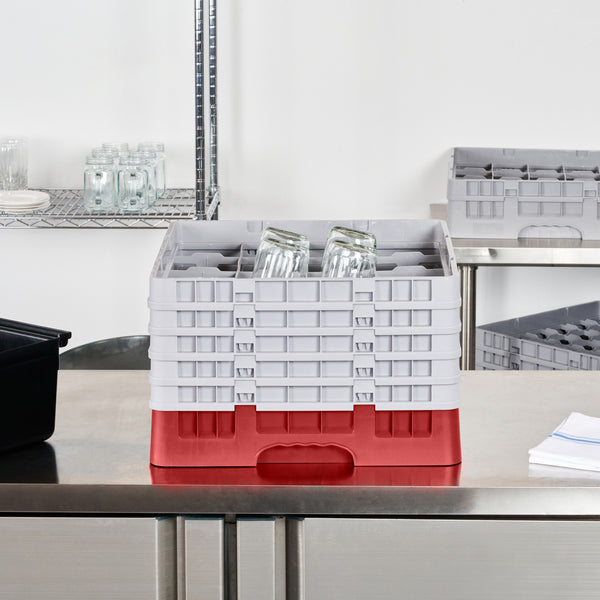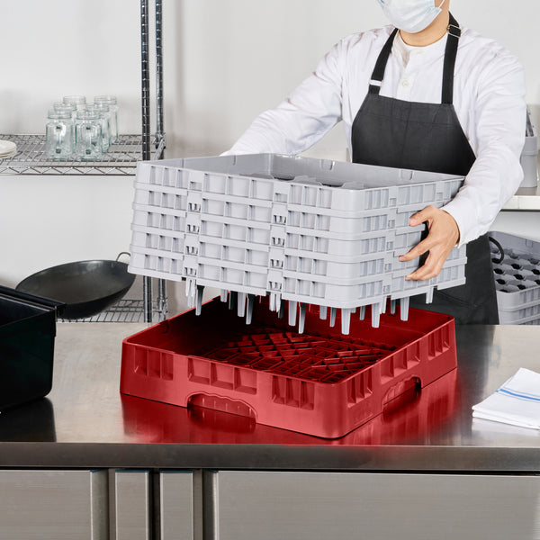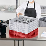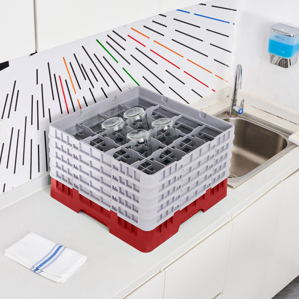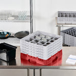 Enhance your barware organization with our Clean Tek Professional Red Glass Rack, designed to streamline glassware storage in any bustling restaurant or bar. This commercial glass rack boasts 16 compartments, providing ample space for securely storing a variety of glassware. With a dishwasher rack featuring 1 full drop extender, this rack offers versatile height adjustment to accommodate different glass sizes. The easy-to-handle design ensures effortless movement and stacking, making them an ideal compartment rack for high-volume settings. Plus, with the durable PP construction, this rack withstands the rigors of daily use while maintaining its structural integrity. The open interior compartments promote efficient air circulation for faster drying times, enhancing the functionality of this barware organizer. Solid external walls provide additional protection, preventing accidental damage during transport or storage. Measuring 19.69 inches in length by 19.69 inches in width by 12.13 inches in height, this dishwasher rack fits seamlessly into standard commercial dishwashers. Sold in a 1 count box.