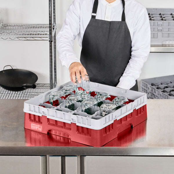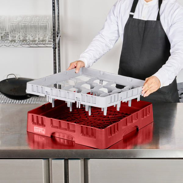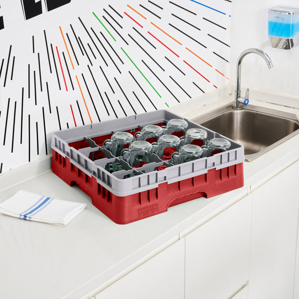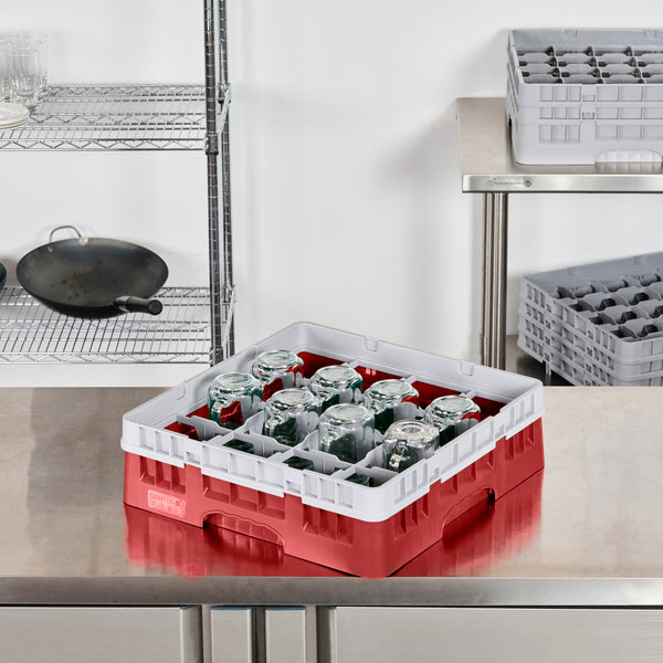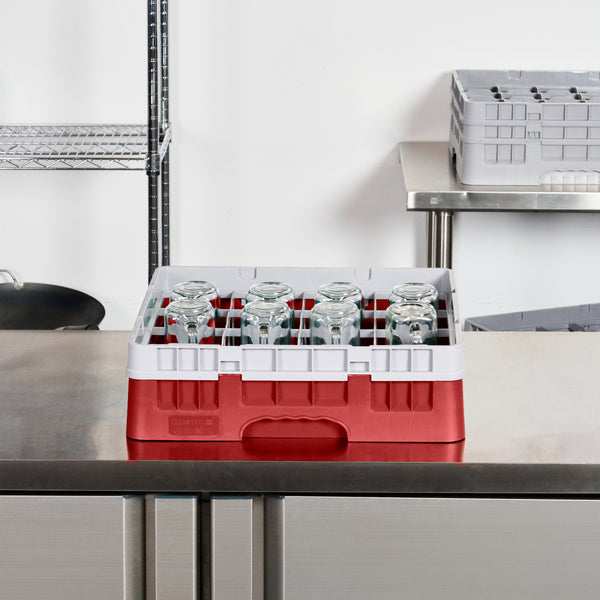 Optimize your glassware storage with our Clean Tek Professional Red Glass Rack. This dishwasher rack features 16 compartments, ensuring your glassware remains organized and protected during cleaning. For versatility, this compartment rack includes 1 full drop extender, making it adaptable to various glass heights. Constructed from durable PP, this commercial glass rack is built to withstand the rigors of daily use. The easy-to-handle design of this barware organizer simplifies transport and storage. Open interior compartments in this rack allow for thorough cleaning and quick drying of glassware. Solid external walls of this rack provide extra stability, ensuring the protection of your glassware. Measuring 19.69 inches in length by 19.69 inches in width by 5.63 inches in height, this glassware storage solution fits seamlessly into any commercial kitchen setup. Sold in a 1 count box.