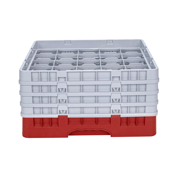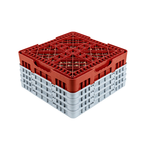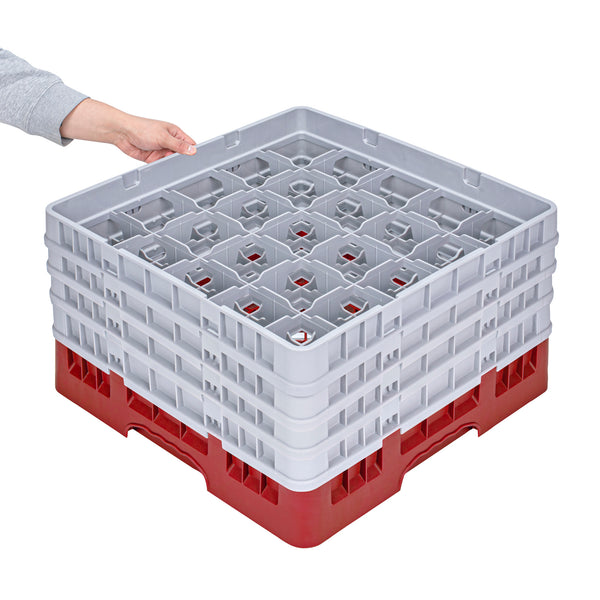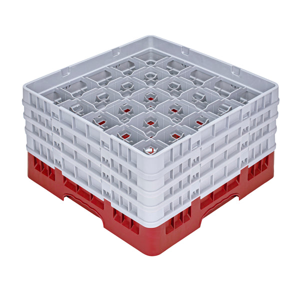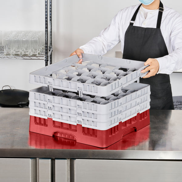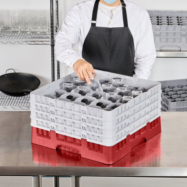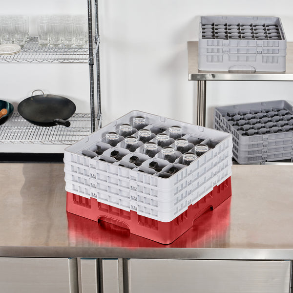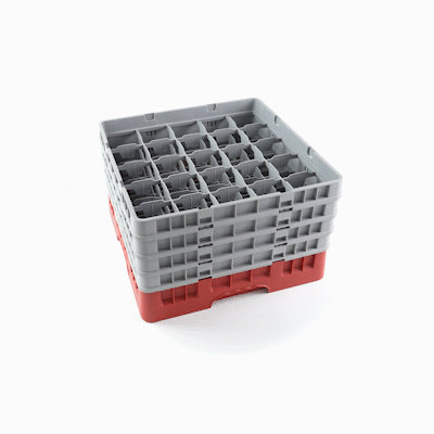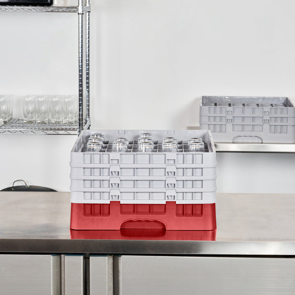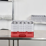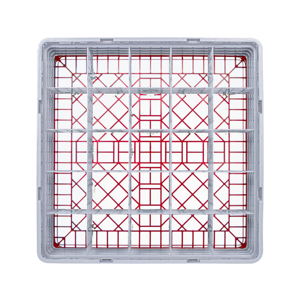 Optimize your glassware storage with our Clean Tek Professional Red Glass Rack. Featuring 25 compartments, this commercial glass rack ensures each piece of glassware is securely held in place. With a full drop extender and three half drop extenders, this dishwasher rack accommodates various glass heights, making it versatile for all your needs. Constructed from durable PP, this rack is built to withstand the rigors of commercial kitchens. Designed with an easy-to-handle framework, this compartment rack simplifies the loading and unloading process. The open interior compartments allow for thorough cleaning and quick drying, while the solid external walls provide extra protection during transport. Measuring 19.69 inches in length by 19.69 inches in width by 10.51 inches in height, this barware organizer fits effortlessly into most commercial dishwashers and storage areas. Sold in a 1 count box.