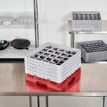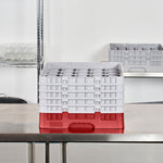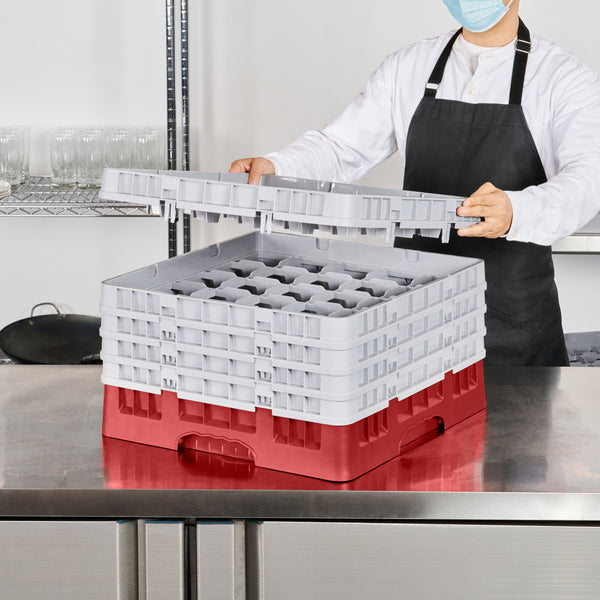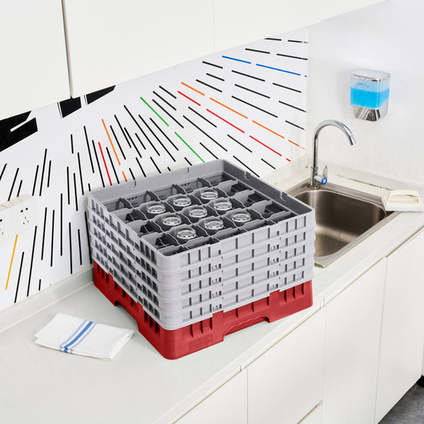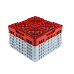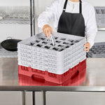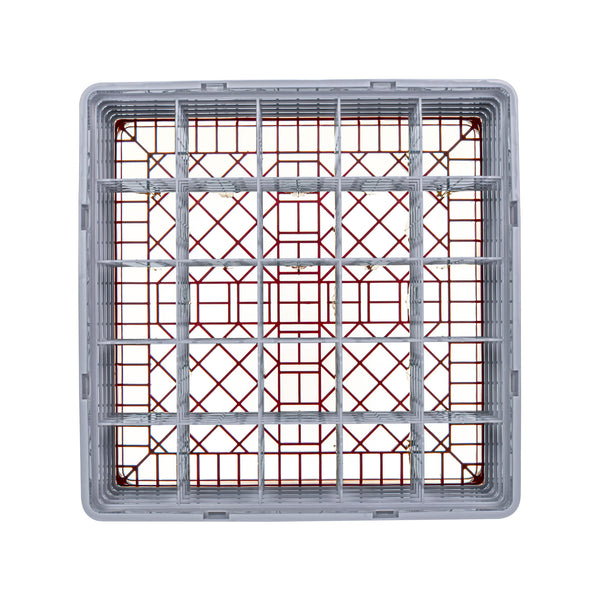 Optimize your glassware storage with our Clean Tek Professional Red Glass Rack. This commercial glass rack features 25 compartments, ensuring each glass has its own secure spot. Designed with a 1 full drop extender, this compartment rack accommodates taller glassware effortlessly. For added versatility, this glass rack includes 4 half drop extenders, making it a versatile barware organizer. Constructed with durable PP, this dishwasher rack guarantees long-lasting use in busy foodservice settings. The easy-to-handle design of this glass rack allows for hassle-free transport and storage. With open interior compartments, this glassware storage solution ensures thorough cleaning and drying. Solid external walls provide extra protection, keeping your glassware safe and intact. Measuring 19.69 inches in length by 19.69 inches in width by 12.13 inches in height, this commercial glass rack fit seamlessly into most commercial dishwashers. Sold in a 1 count box.