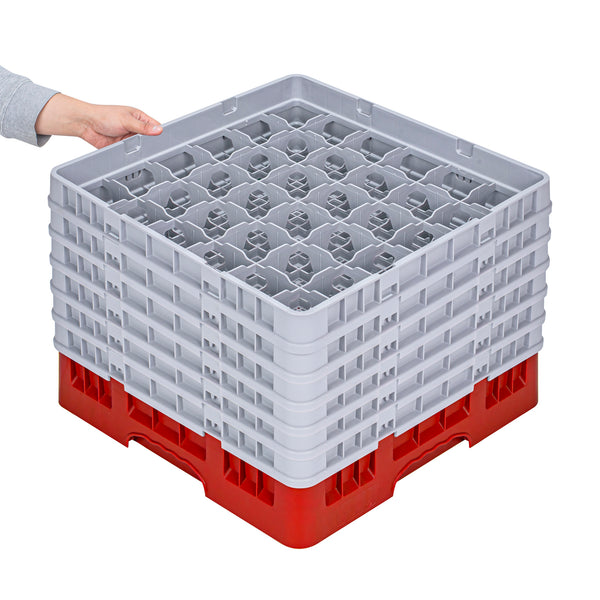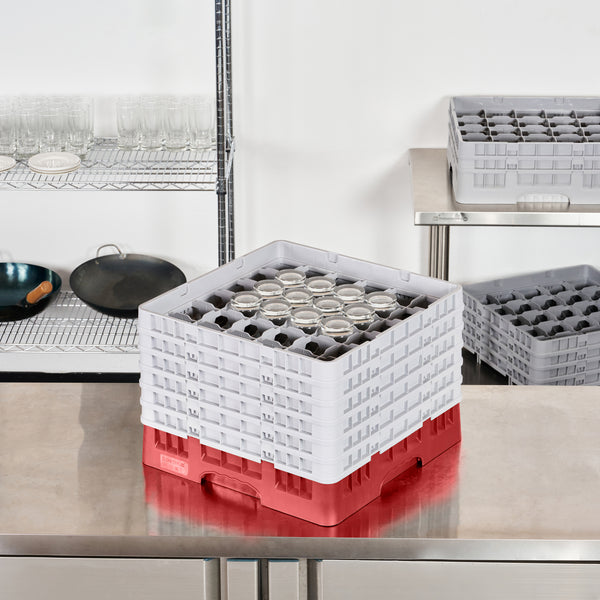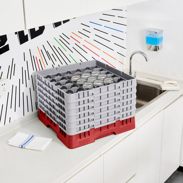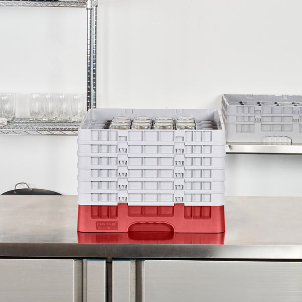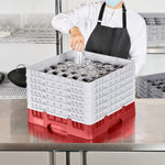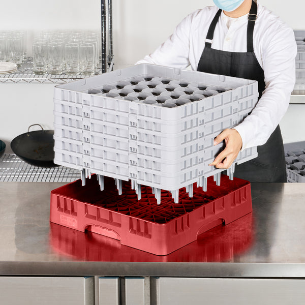 Our Clean Tek Professional Red Glass Rack offer the ultimate solution for glassware storage in bustling foodservice settings. This rack features 36 compartments, providing a specific space for each glass to prevent breakage and ensure optimal dishwasher rack organization. Designed with a full drop extender and five half drop extenders, this compartment rack easily adapts to various glass heights, enhancing the efficiency of your barware organizer system. Constructed from durable PP, this rack ensures long-lasting use, making it a reliable commercial glass rack for any establishment. The easy-to-handle design of this glass rack allows for effortless transport and installation, streamlining operations in busy kitchens. With open interior compartments, this rack ensures thorough cleaning and drying of your glassware, while the solid external walls provide extra protection during transport. Measuring 19.69 inches in length by 19.69 inches in width by 13.74 inches in height, this rack is perfectly sized to accommodate a wide range of glassware. Sold in a 1 count box.