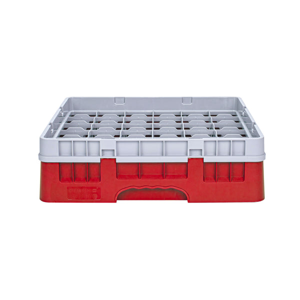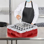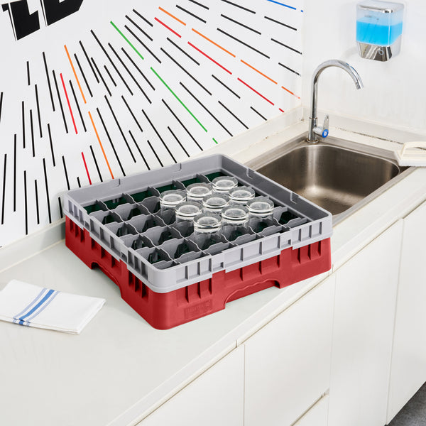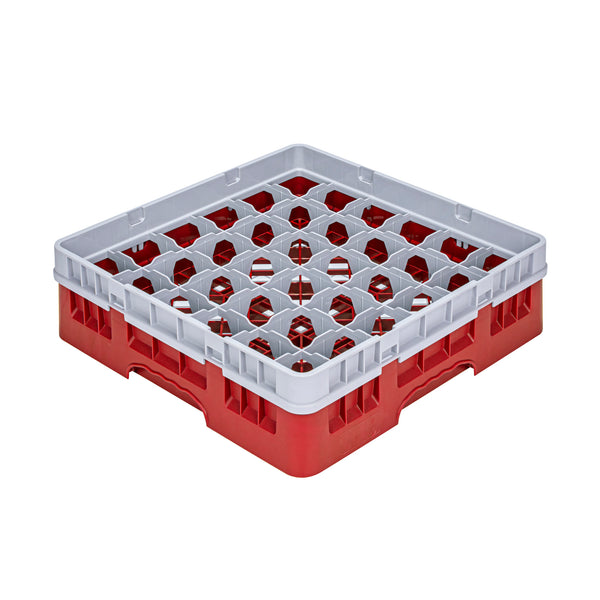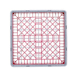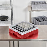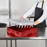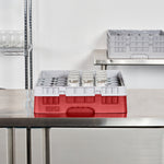 Efficiently organize and protect your glassware with our Clean Tek Professional Red Glass Rack. This glassware storage solutions feature 36 compartments, ensuring each glass has its own space to prevent damage. Designed with a full drop extender, this dishwasher rack accommodates taller glasses with ease. The durable PP construction of this compartment rack ensures long-lasting use in busy commercial kitchens. Featuring an easy-to-handle design, this barware organizer allows for quick and effortless transportation. The open interior compartments of this commercial glass rack facilitate thorough cleaning and drying. Solid external walls provide additional stability and protection for your valuable glassware. Measuring 19.69 inches in length by 19.69 inches in width by 5.63 inches in height, this glass rack fits seamlessly into most commercial dishwashers. Sold in a 1 count box.
