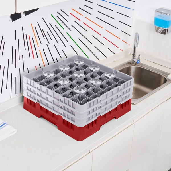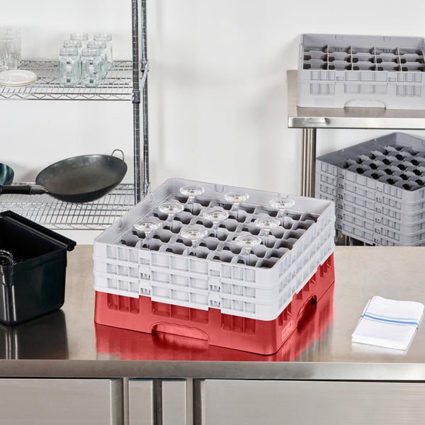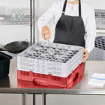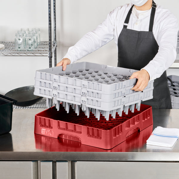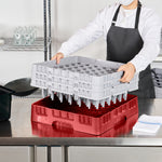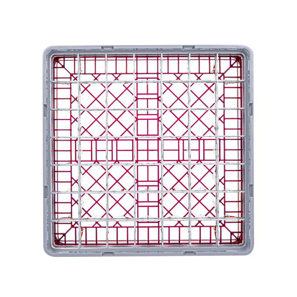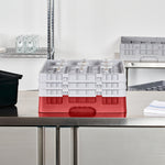 Our Clean Tek Professional Red Glass Rack provides the ultimate solution for efficient glassware storage in any busy kitchen or bar. This dishwasher rack systems feature 49 compartments, ensuring each piece of glassware is safely stored and protected during washing. Designed with a compartment rack layout, they include a full drop extender and two half drop extenders, adapting to various glass sizes and enhancing usability. The durable PP construction of this barware organizer ensures long-lasting performance and reliability in commercial settings. With an easy-to-handle design, this commercial glass rack makes transporting and organizing your glassware effortless. Open interior compartments allow for optimal water flow and thorough cleaning, while solid external walls offer stability and protection. Measuring 19.69 inches in length by 19.69 inches in width by 8.86 inches in height, this glassware storage solution fits seamlessly into most commercial dishwashers. Sold in a 1 count box.