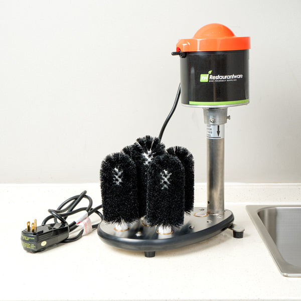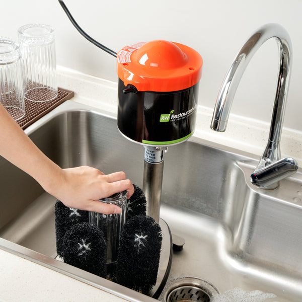 The enclosed motor and top guard of this electric glass washer for bars keep water out to avoid damage. Plus, it automatically turns off if it is overheated.