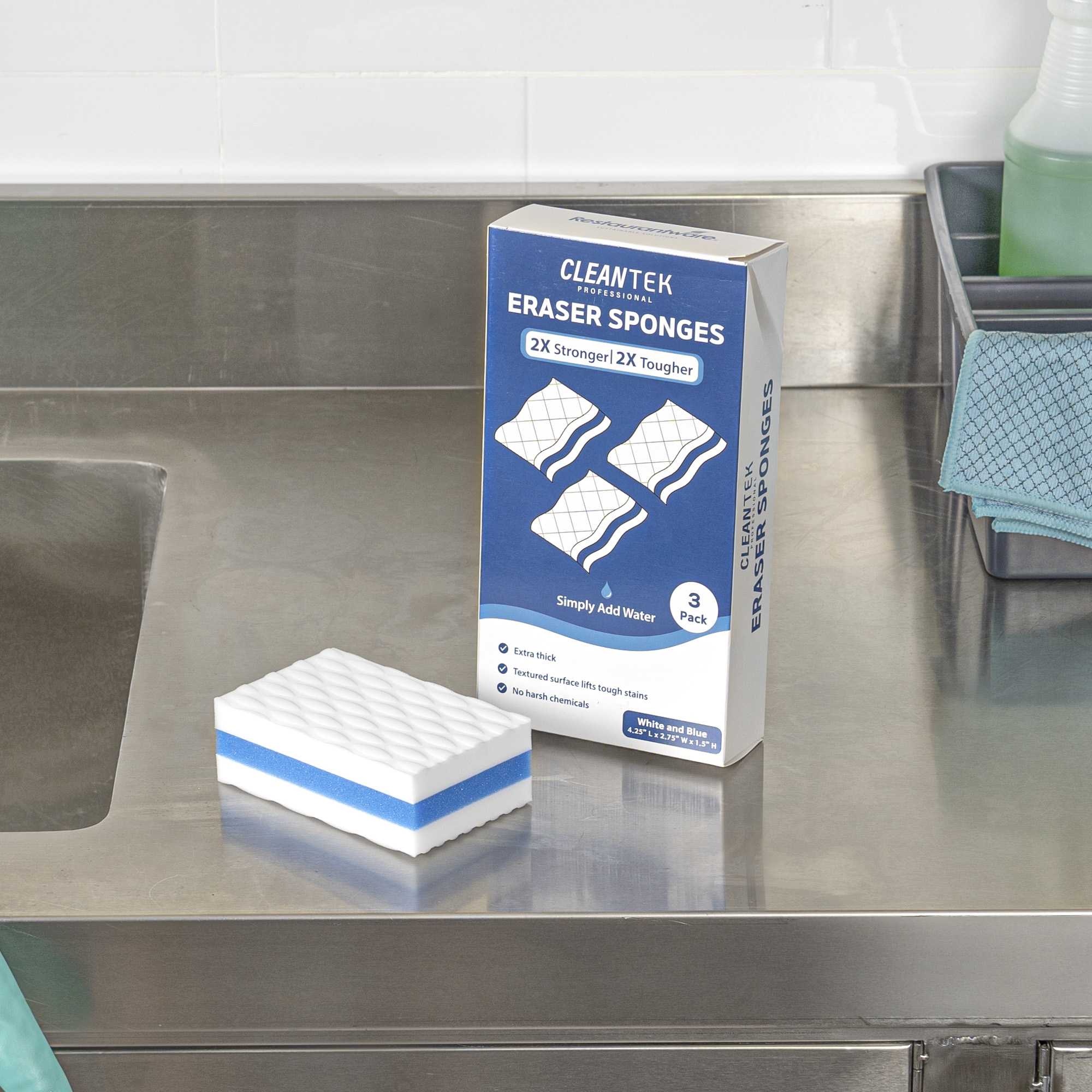 Effortlessly tackle stubborn stains with the Clean Tek Professional Stain-Remover Sponge Eraser. This sponge eraser is designed to eliminate tough stains with ease, ensuring your cleaning process is swift and effective. Made from durable plastic, this versatile melamine cleaning sponge is perfect for use on walls, floors, doors, baseboards, and appliances, offering unmatched flexibility in your cleaning routine. Its compact size, measuring 4.33 inches in length, fits into tight spaces, making it an ideal stain remover sponge for efficient use in any commercial kitchen or dining setting. Enhance the cleanliness and appearance of your establishment with this indispensable cleaning tool. Each order includes 3 Clean Tek Professional Stain-Remover Sponge Erasers.