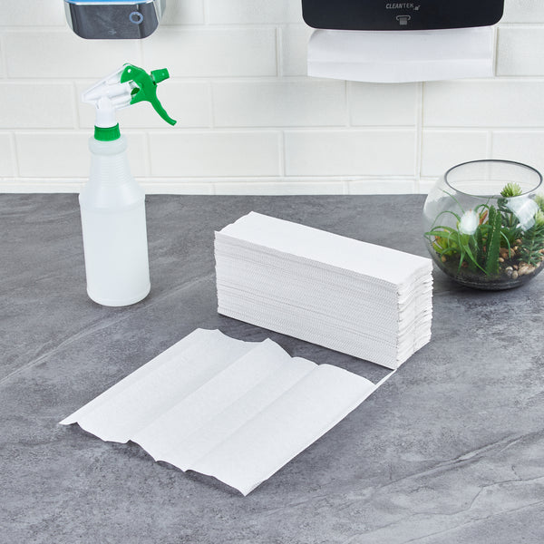 Wipe away huge liquid messes in a jiffy with our Clean Tek Professional White C-Fold Paper Towels. Made using paper pulp, these paper towels are durable and will not tear easily when wiping spills. These 1-ply paper towels with an embossed texture ensure that no drop of water is left behind. The C-fold design of these bathroom paper towels reduces excess consumption since it only allows one napkin to be dispensed at a time. These C-fold paper towels, with their sleek fold, perfectly fit inside our C-fold / M-fold paper towel dispensers (SKU: RWT1189B & SKU: RWT1189W). To make post-event cleanups easier, these embossed paper towels are disposable. These paper napkins are not interlocked and can be used as individual tissues, allowing you to keep them on tables for outdoor events. Measuring 11.5 inches long by 9.5 inches wide when unfolded and 3.25 inches wide when folded, these white paper towels allow easy placement into dispensers and save space while storing. Shipped in a 2,400 count box. Dispensers are available and sold separately.