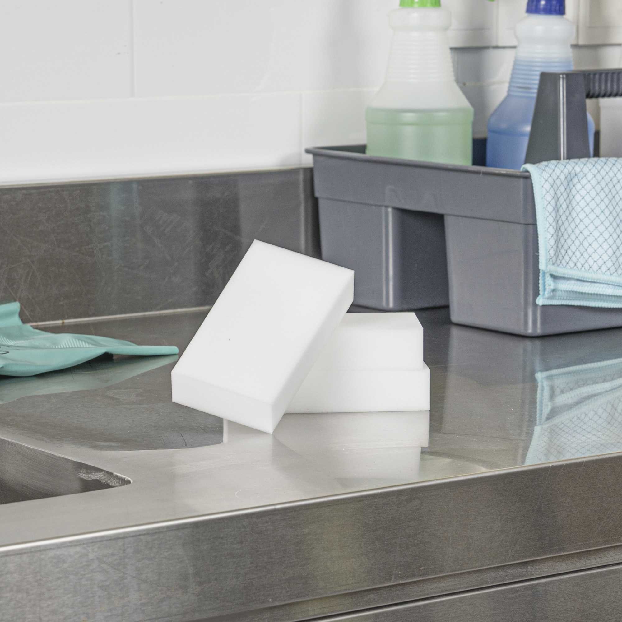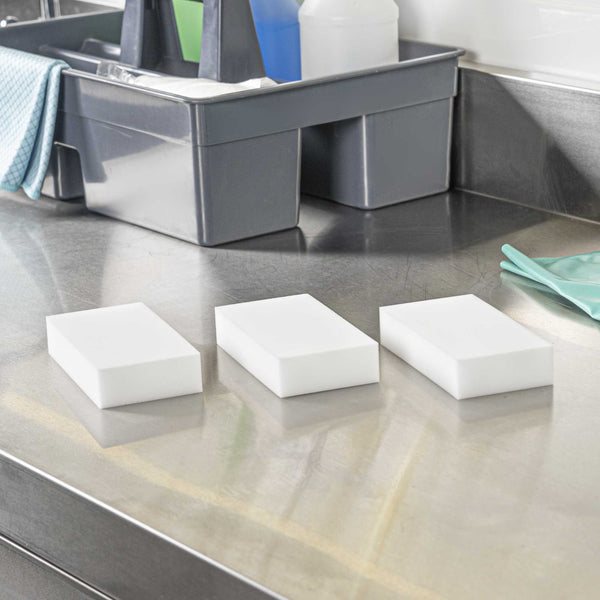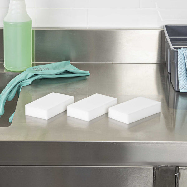 Effortlessly tackle tough stains with our versatile cleaning solution. The Clean Tek Professional Melamine Foam Sponge is expertly designed to eliminate tough stains with ease, providing a quick cleanup for busy establishments. This melamine sponge, made from durable plastic, is water-activated, making it an effective eraser for various surfaces like walls, floors, doors, baseboards, and appliances. Its compact size of 4.72 inches in length ensures it fits seamlessly into tight spaces, enhancing its ability as a stain remover sponge in any commercial kitchen or dining area. The white color of the sponge indicates cleanliness and ensures dirt visibility for thorough cleaning. Elevate your maintenance routine with this essential cleaning tool, optimizing your cleaning efficiency. Each order includes 3 Clean Tek Professional Melamine Foam Sponges.