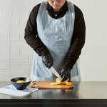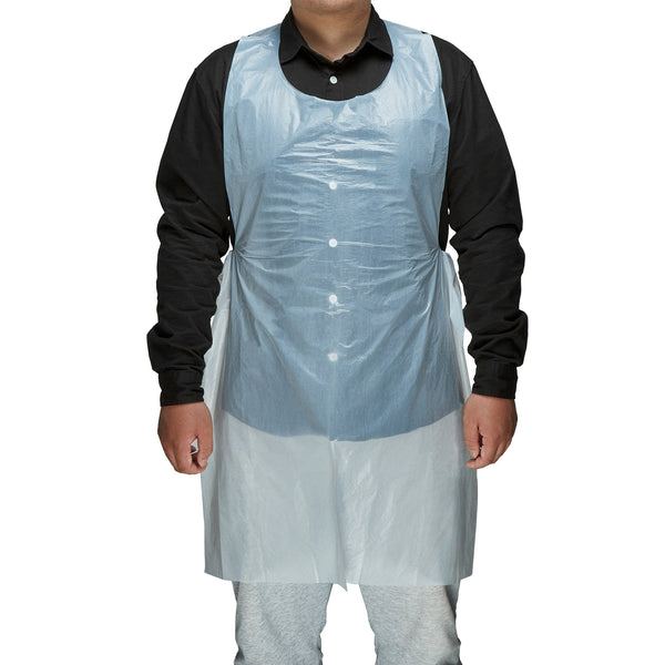 Protect employee's uniforms with our Clean Tek Professional White Plastic Disposable Apron. These full-sized aprons cover the chest area and the top part of the legs to keep clothes dry and free from unsightly stains. Equipped with extra-long ties, these high-quality aprons provide a comfortable and secure fit for your foodservice employees. Great for prep cooks, dishwashers, and bussers, these foodservice aprons are water-resistant to maintain their appearance throughout busy work hours. Crafted from premium plastic, these disposable aprons are recyclable to streamline cleanup and help you save on washing machine expenses. Designed with a white finish, these unisex plastic aprons perfectly blend with the dress code at your bakery, cafeteria, deli, restaurant, or catering service. Plus, their glossy shine adds a professional look to your work environment. These disposable chef aprons measure 42 inches long and 27.5 inches wide. Ships in a 1000 count box.