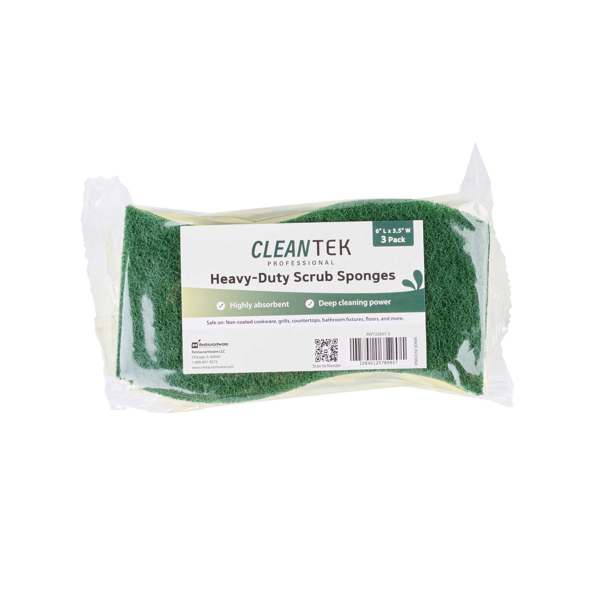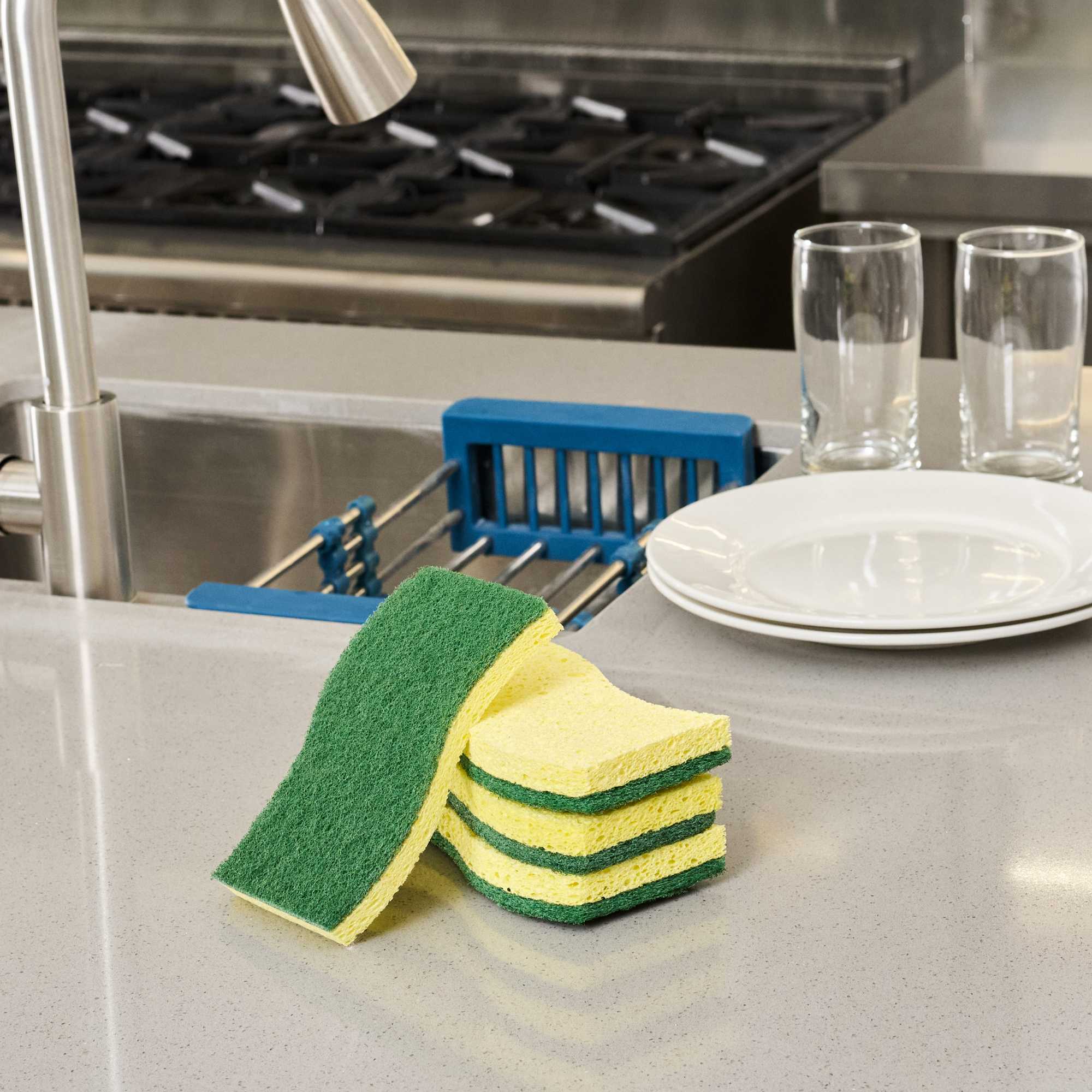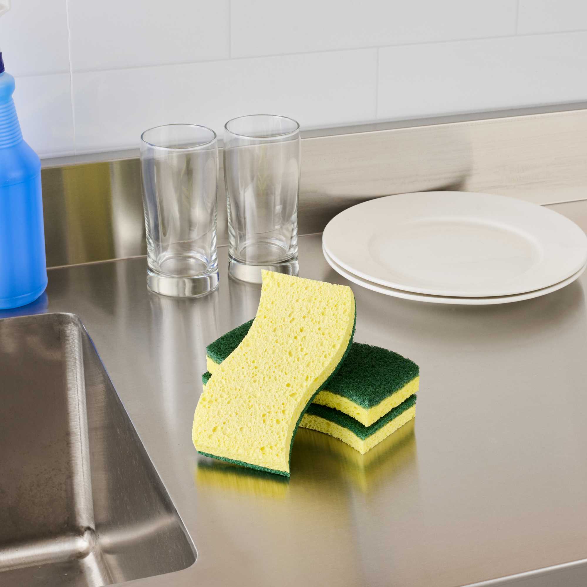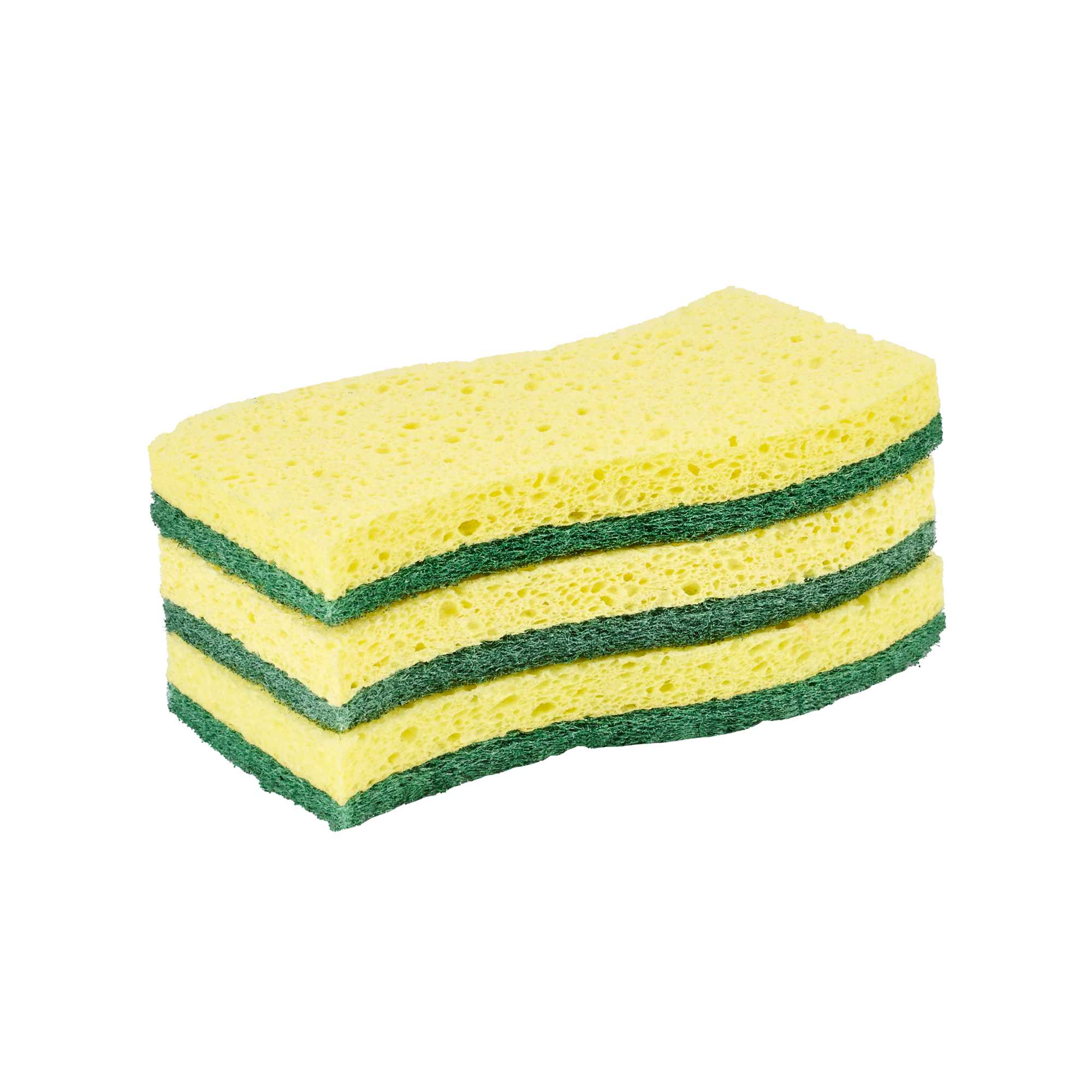 Conquer kitchen cleaning tasks with our Clean Tek Professional Yellow Cellulose Sponge / Green Heavy-Duty Scouring Pad Combos. Combining a yellow sponge and a green scouring pad in one robust tool, apt for scrubbing walls, railings, floors, and countertops in commercial kitchens. Its dual-sided design tackles tough grease and grime efficiently, while the wavy shape ensures a comfortable grip, allowing for extended use without discomfort. Crafted from absorbent cellulose, these kitchen sponges quickly soak up liquids, making them ideal for cleaning coffee makers, desks, and stairways. Its large surface area cleans dishes quickly and efficiently, making it an indispensable tool in busy foodservice settings. The heavy-duty scrubbers are effective for removing baked-on food residue and grease, making them a versatile sponge scrubber for any task. These sponges measure 5.98 inches in length by 3.5 inches in width. Sold in a 3 count box.