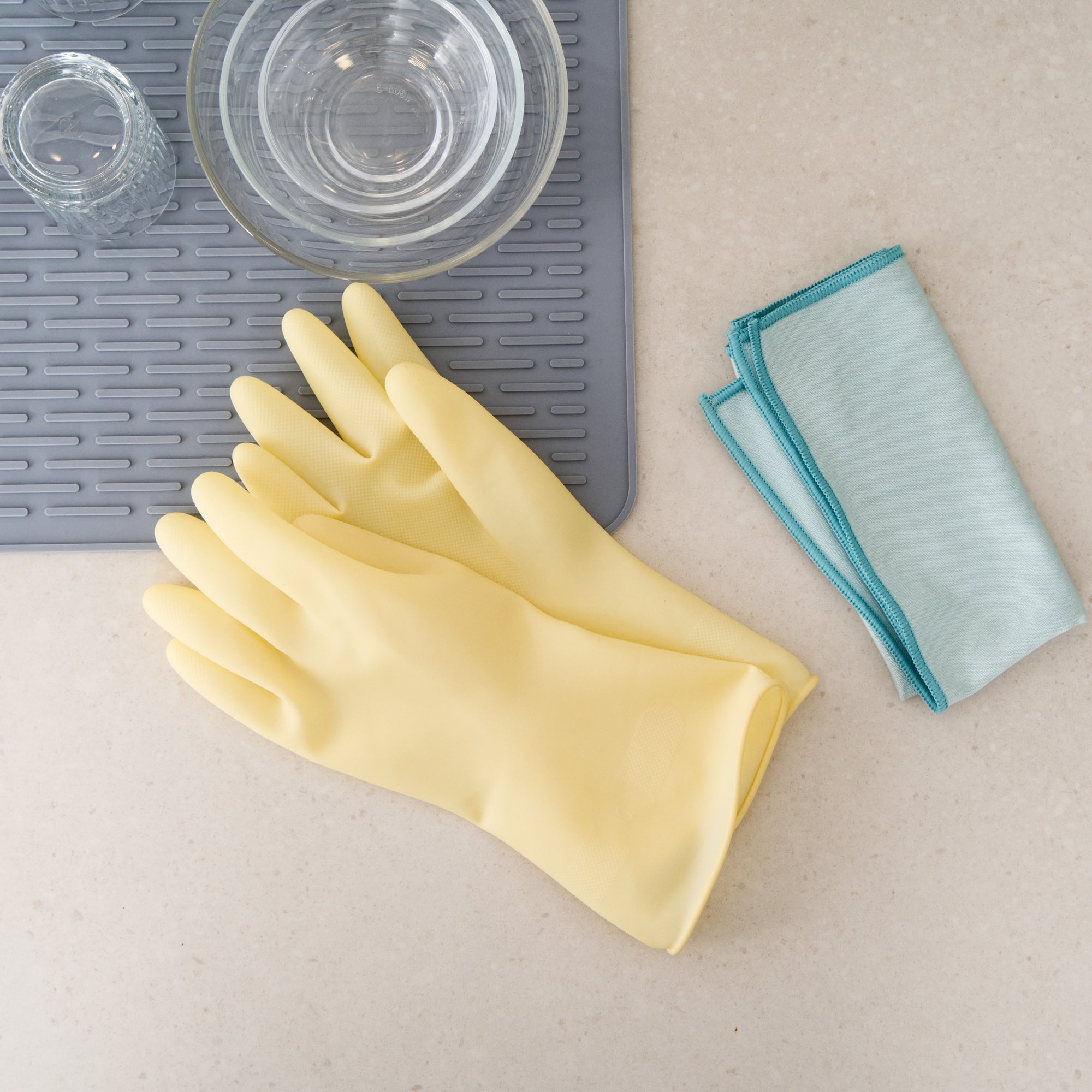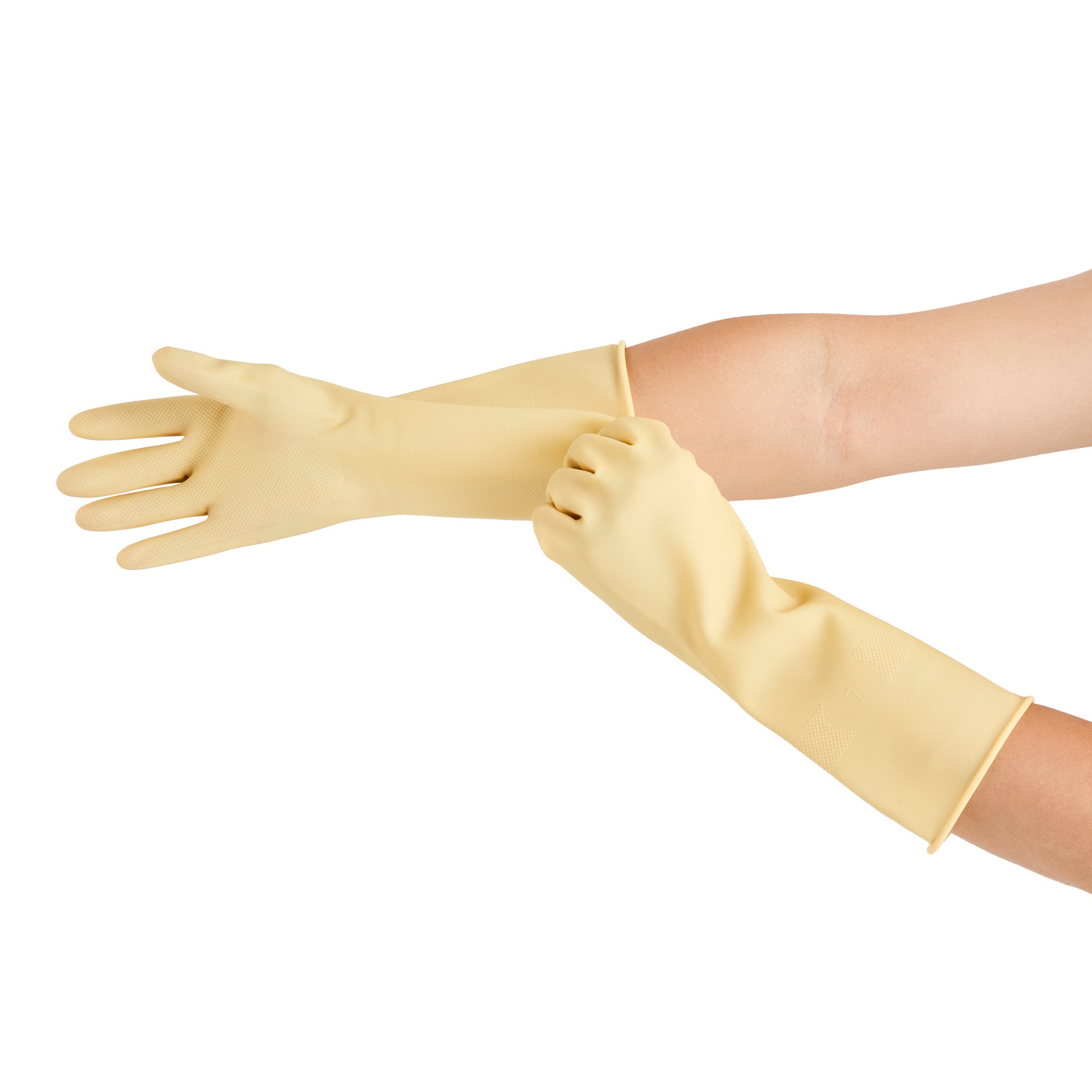 Enhance safety and efficiency in your foodservice operations. Clean Tek Professional Chemical-Resistant Latex Gloves provide unmatched protection with their durable 22-mil thickness, ensuring your hands remain safeguarded during rigorous cleaning tasks. These latex gloves feature a textured surface that ensures a non-slip grip, offering precision and control even when dealing with slippery items. The long cuff design extends 13 inches to shield wrists and forearms from liquids and debris, making them ideal for dishwashing gloves scenarios. Constructed from chemical-resistant latex, these rubber gloves protect against a variety of cleaning agents, essential for maintaining high sanitation standards in foodservice environments. Their extra-large size guarantees a comfortable fit, reducing hand fatigue for individuals with larger hands during prolonged use. Each order includes 1 Pair of Clean Tek Professional Chemical-Resistant Latex Gloves.
