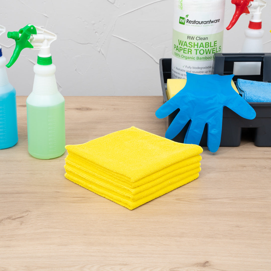 Quickly clean surfaces with our Clean Tek Professional Yellow Microfiber Cleaning Cloths. These cleaning cloths are made from a blend of polyester microfibers that can be used to effectively polish surfaces at your foodservice establishment. Naturally streak-free and lint-free, these microfiber rags leave dining tables spotless to provide customers with reassurance that tables have been thoroughly cleaned. These streak-free microfiber cloths feature a yellow finish that can be used in a color-coded cleaning system to keep cloths organized and prevent cross-contamination. Conveniently able to hold up to 4 times more moisture than conventional cotton cloths, these lightweight cleaning cloths are ideal for soaking up accidental spills, scrubbing kitchen equipment, or cleaning windows. These reusable cleaning cloths can be laundered in the washing machine to provide you with a reliable way to wash cloths after use and minimize waste at your establishment. Each absorbent cleaning wipe measures 16 inches in length by 16 inches in width. Shipped in a 10 count box.