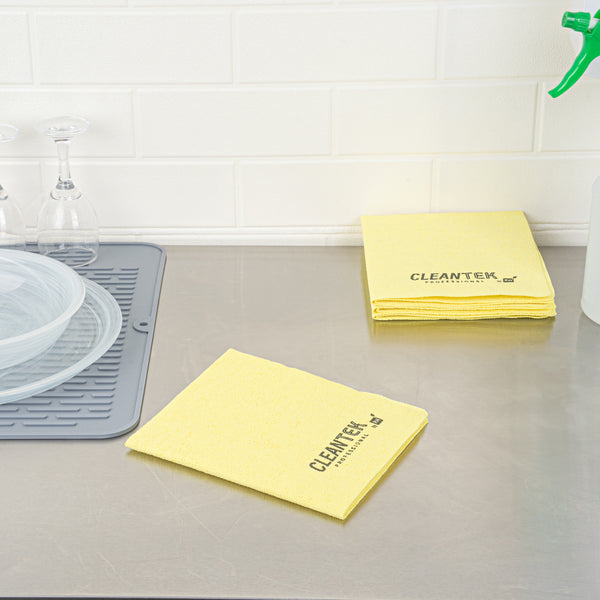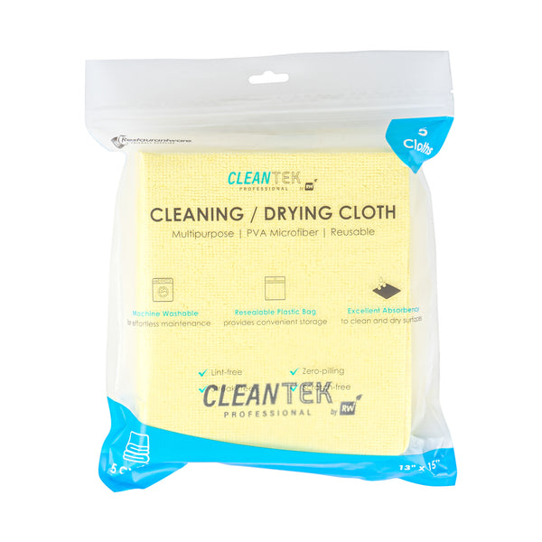 Maximize your cleaning efficiency with our Clean Tek Professional Yellow Microfiber Cleaning / Drying Cloths. Made from PVA microfiber, these cleaning cloths are designed to harden when they dry, ensuring they do not breed bacteria. These microfiber towels are highly absorbent to efficiently soak up liquids for effective and thorough cleaning. Ideal for dusting, polishing, and wiping surfaces, these cleaning rags are multipurpose to offer versatility in cleaning a wide range of household and professional applications. These microfiber cloths are lint-free to ensure a clean and effective wiping experience, leaving surfaces free from unwanted fibers and contributing to a high level of cleanliness. The zero-pilling design of these cleaning towels ensures a durable and effective cleaning experience, preventing the formation of fuzzy balls. Compatible with various types of cleaning agents, these car wash towels offer versatility for all your cleaning tasks. These wiping rags are scratch-free and provide a gentle and effective cleaning solution to ensure surfaces remain free from scratches or damage during use. For convenient storage and preserving cleanliness for future use, these yellow cleaning cloths come in a resealable plastic bag. Each microfiber rag is machine washable, ensuring easy maintenance and long-lasting use. The yellow finish of these drying cloths facilitates easy identification, reducing the risk of mix-ups and ensuring efficient use for specific tasks. Measuring 13 inches in length by 15 inches in width, these yellow drying cloths offer a generous surface area for efficient cleaning. Sold in a 5 count box.