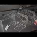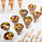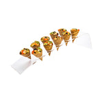 Create extraordinary appetizer or dessert displays with our Clear Tek Clear Acrylic Angled Cone Stand. Constructed from crystal-clear acrylic, this buffet display stand is durable and withstands high-volume commercial use. Designed with a sleek, geometric shape, this acrylic food display stand allows you to showcase delicious treats at an eye-catching angle for an upscale presentation. Equipped with 10 slots for serving individual cones, this standalone acrylic stand is great for buffets, banquets, weddings, and other catered events. This acrylic food stand perfectly fits our medium pinewood cones (SKU: RWB0153) and bamboo cones (SKU: RWB0108). The sloping, angled design of this food stand provides a visually appealing way to serve a selection of hors d'oeuvres or ice cream cones, while the transparent design gives the illusion that your treats are suspended in midair. This acrylic dessert display stand measures 21.75 inches in length by 5.5 inches in width by 5.25 inches tall. Sold in a 1 count box. Food cones are available and sold separately.