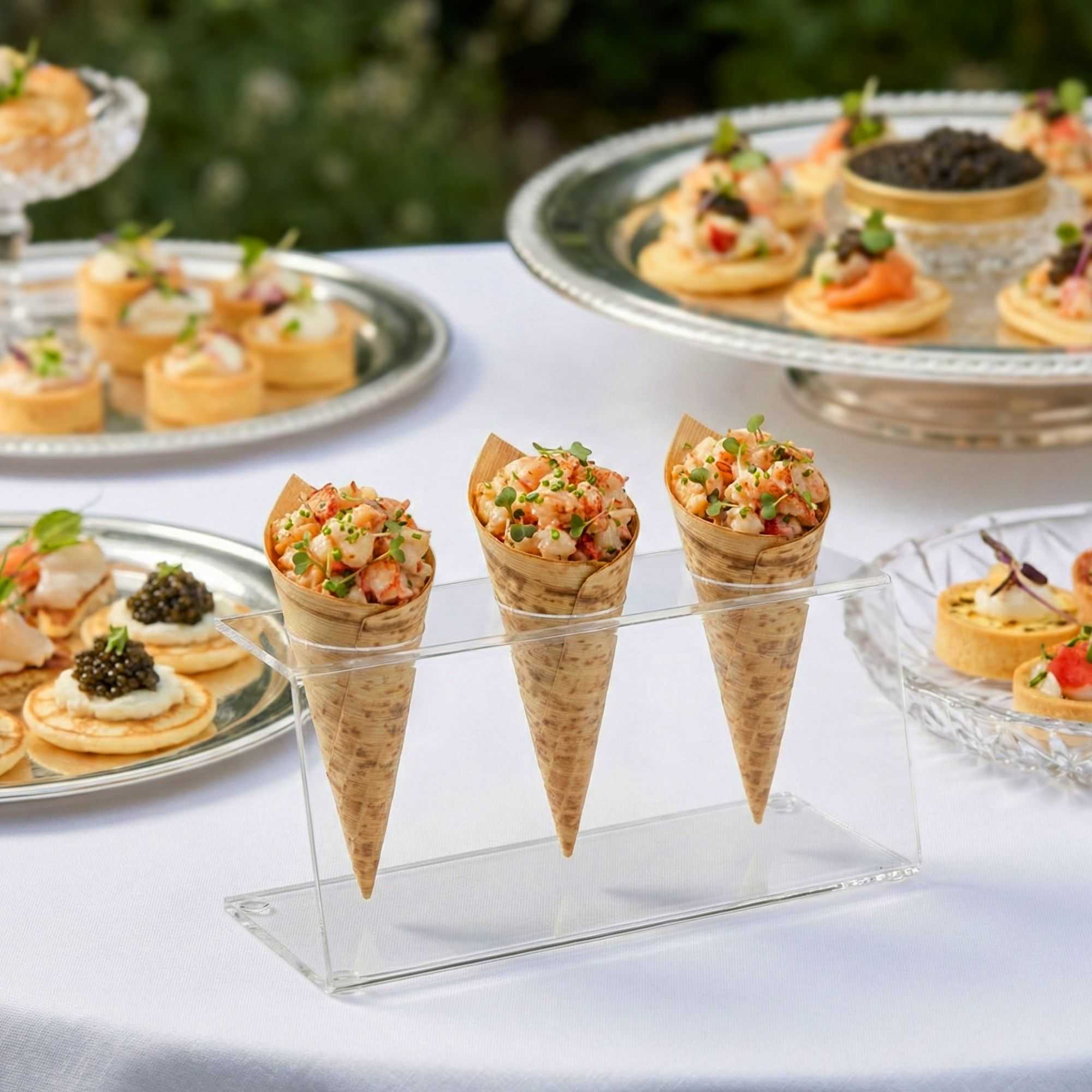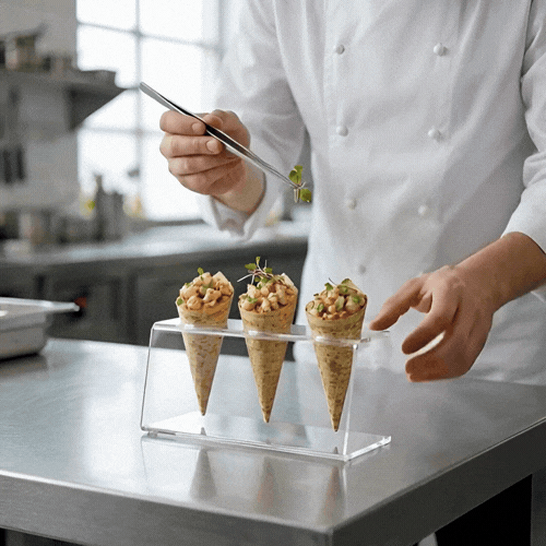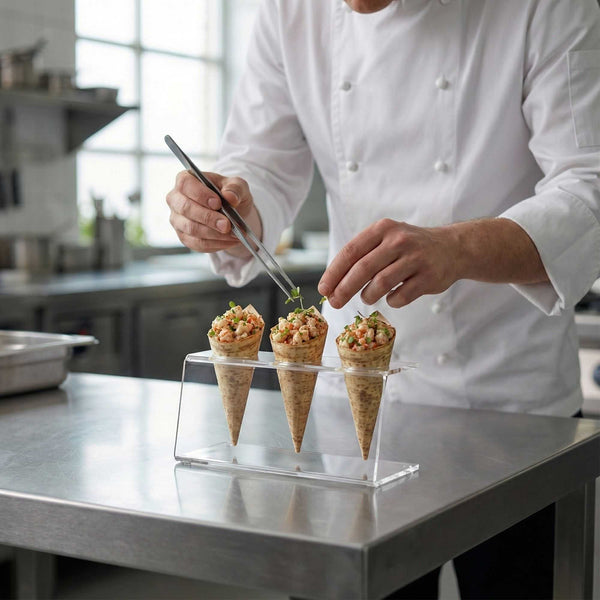 - Modern design elevates the look of appetizer or dessert displays