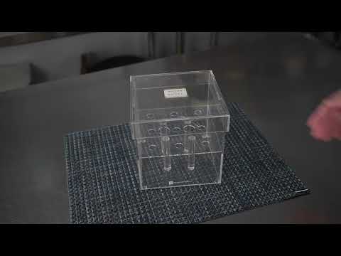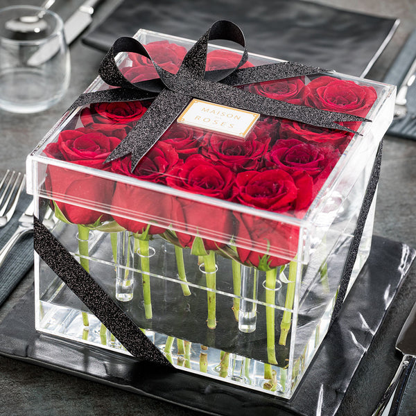 Brilliantly showcase roses, lilies, tulips, and more in our Clear Tek Acrylic Square Flower Box Vase. Crafted from premium acrylic, this fashionable acrylic box clearly displays your beautiful flowers while providing a durable construction. Topped with an elegant black and gold placard reading "Maison des Roses," this unique box for flowers adds a luxurious element to any floral arrangement or flower display. This flower vase is made with an interior panel that holds up to 16 flowers and a lower compartment that can be filled with water, your floral arrangements will stay upright and fresh. With a removable lid, this acrylic flower box securely protects your fresh flowers and prevents water from leaking out during transportation. This acrylic flower box brings a modern twist to centerpieces at your trendy bar, upscale restaurant, catering event, and more. Each clear vase measures 8 inches long by 8 inches wide by 6 inches tall. Sold in a 1 count box.