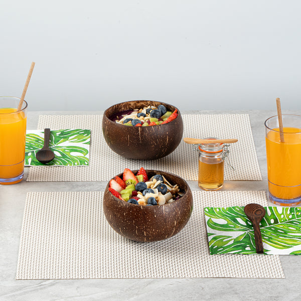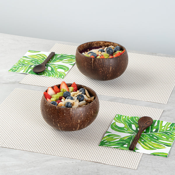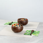 Elevate every dish with the Coco Casa 4-Piece Handmade Coconut Bowl and Wooden Spoon Set. Handmade for authenticity, these coconut serving bowls (7.25 inches in diameter) add a unique flair to any culinary presentation. Perfect for versatile dining needs, the 4-piece set includes bowls and wooden spoon set, allowing chefs to serve soups, salads, or desserts comfortably. Made from sturdy coconut, these bowls are suitable for both warm and cold foods, making them an excellent choice for diverse menu offerings. As a freezer-safe option, these bowls support pre-prepped cold foods, enhancing kitchen efficiency and reducing waste. Compostable and greaseproof, they align with eco-friendly practices, appealing to sustainability-focused establishments. Add a rustic touch to your tableware with this coconut bowl set, a must-have for enhancing dining experiences. Each order includes 10 sets.