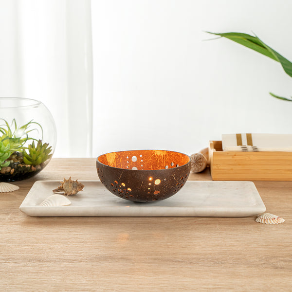 These coconut shell candle holders are handmade from coconut shells and are crafted with charming patterns. Elegance redefined!