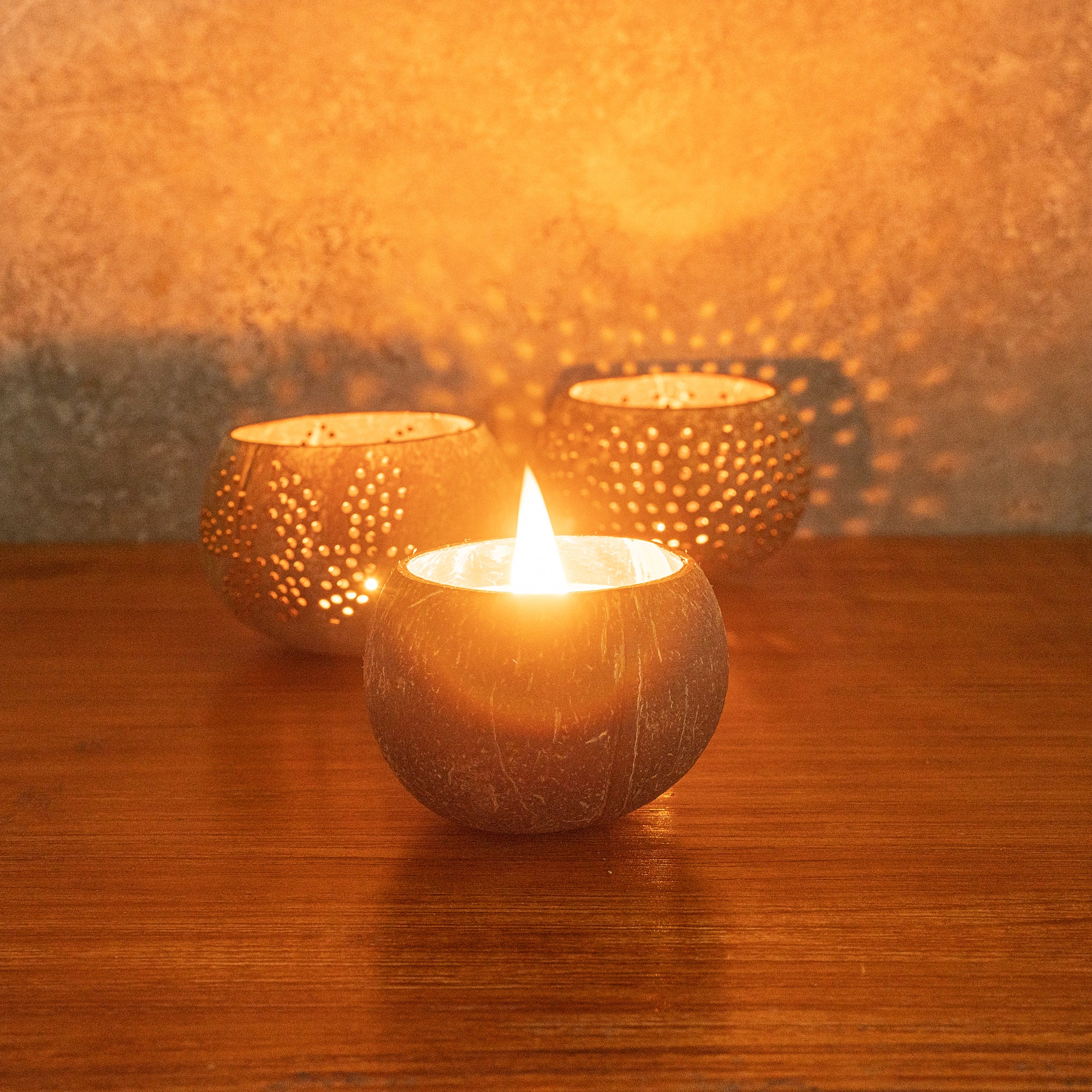 Enhance your dining experience with soothing, natural lighting. The Coco Casa Brown Coconut Shell Candle provides an eco-friendly reusable alternative with its sustainable coconut shell construction, adding a unique, natural aesthetic to any table setting. This soy wax candle features a double wax blend that ensures even burning and optimal scent diffusion, creating a jasmine-scented atmosphere that envelops your restaurant or event space in a calming fragrance. With its wooden wick, this candle maximizes burn time, offering extended enjoyment and making it an ideal choice for busy foodservice environments. Measuring 4 inches by 4 inches by 2.75 inches, this compact candle fits seamlessly into various table arrangements without taking up excessive space. Perfect for enhancing ambiance in restaurants or adding a decorative touch to catered events, this coconut shell candle is a versatile choice for any dining setting. Each order includes 10 Coco Casa Brown Coconut Shell Candle.