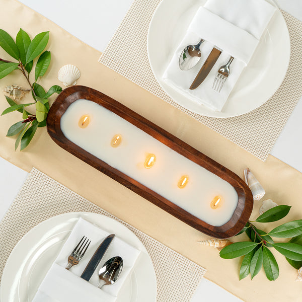 Elevate the ambiance of your bakery, restaurant, or bistro with our Coco Casa Handmade Wood Dough Bowl Candle. This natural and handmade dough bowl candle is hand-poured, ensuring a unique and charming touch to your establishment. The sustainable wooden bowl of this scented candle is crafted from reclaimed waste, reducing waste and promoting eco-friendly practices. With a delightful vanilla fragrance, this wooden bowl candle not only looks stunning but also creates a warm and inviting atmosphere. The double wax blend, featuring soy and coconut wax, is both zinc-free and phthalate-free, making this handmade scented candle a guilt-free indulgence. When this candle is fully used, the wooden bowl can be easily repurposed, making this bread bowl candle an excellent choice for sustainability. The five wooden wicks provide a soothing crackle while the candle burns, lasting up to 20 hours. Commercially compostable and biodegradable, this candle in a wooden bowl helps reduce your establishment's environmental impact. With dimensions of 17.75 inches in length by 5.5 inches in width by 2 inches in height, this wood dough bowl candle makes a stunning centerpiece or decorative accent. Sold in a 1 count box. This item will only degrade outside of the traditional solid waste stream.