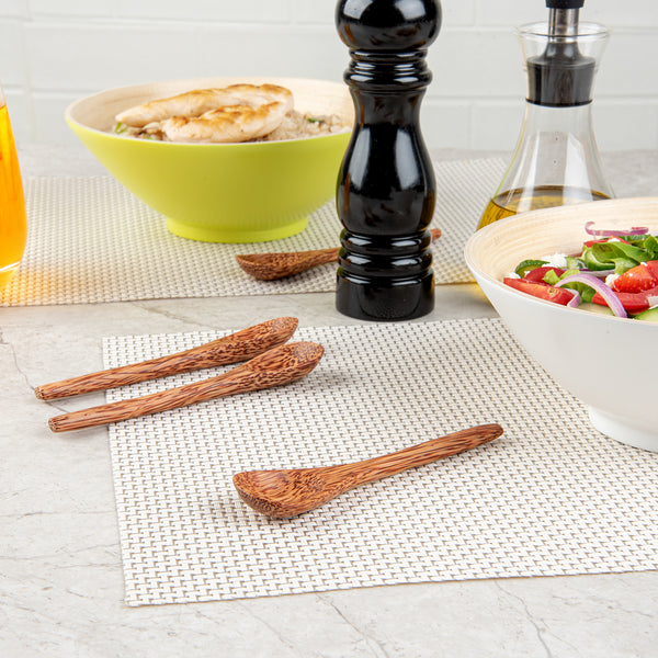 Add a touch of charm to your table settings with our Coco Casa Natural Handmade Coconut Spoons. These greaseproof coconut shell spoons offer a unique alternative to traditional cutlery, enhancing the presentation of your dishes with their natural charm. Made from biodegradable materials, these spoons support sustainable practices by reducing environmental impact, making them an ideal choice for eco-conscious establishments. Their handmade design ensures a unique appearance in presentations, allowing each piece to stand out aesthetically. With heat tolerance, these tropical-themed serving spoons are perfect for handling hot dishes, adding versatility to your service. The durable coconut material withstands daily rigors in any kitchen, while their greaseproof design maintains a pristine condition even after serving oily dishes. Measuring 5.5 inches in length, these cutlery pieces are perfect for serving a variety of dishes. Sold in a 4 count box. These items will only degrade outside of the traditional solid waste stream.